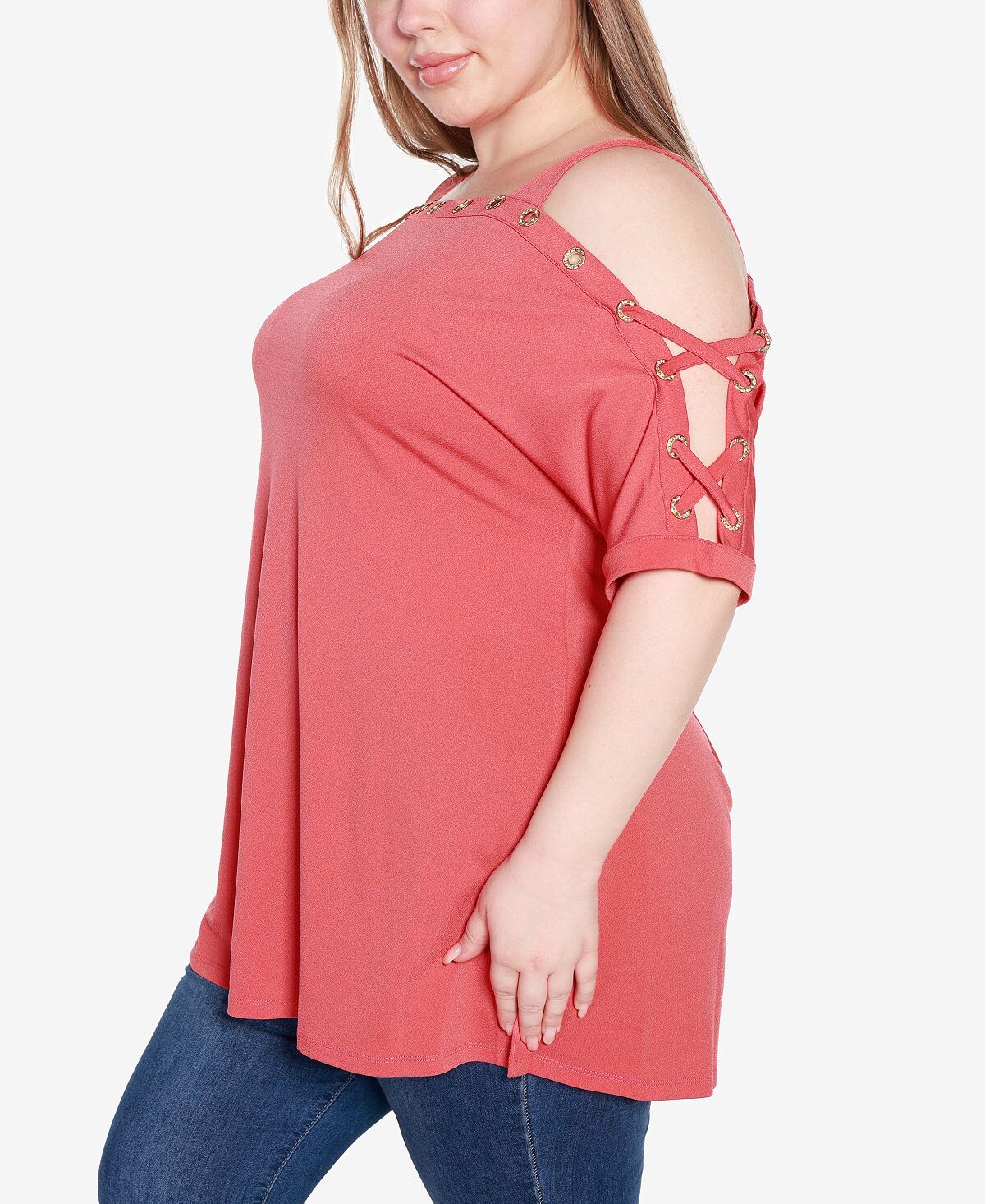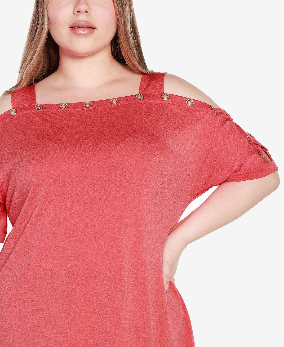 Отделка с люверсами добавляет драматизма игривым вырезам с открытыми плечами на шикарном топе Belldini, дополненном лестно удлиненной моделью и структурированным квадратным вырезом.