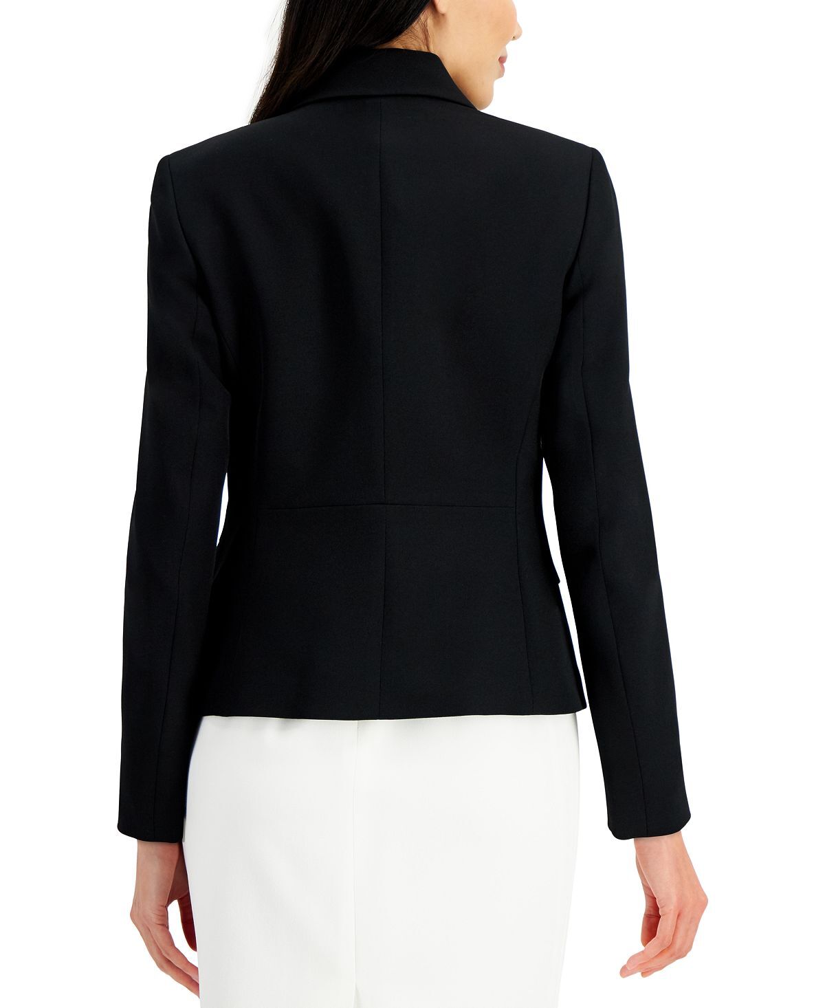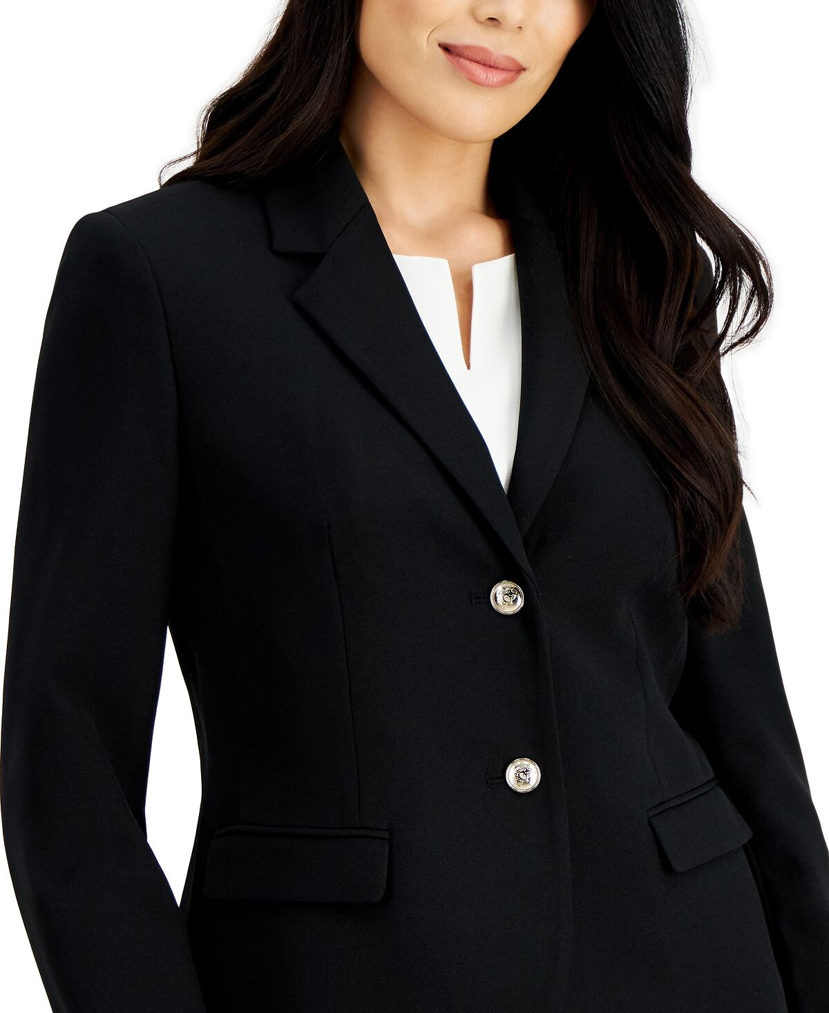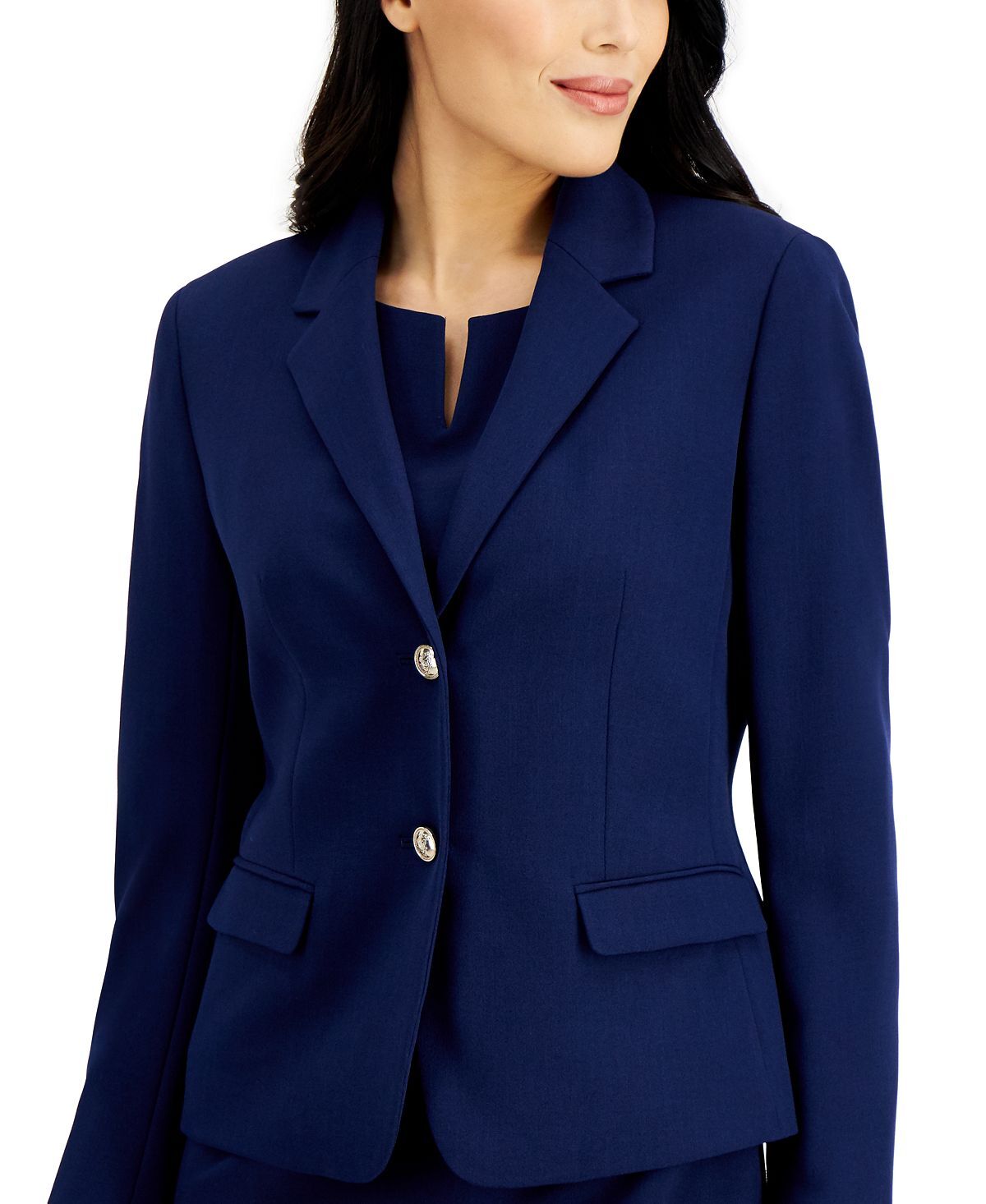 Блестящие пуговицы завершают изящные классические линии жакета Kasper с фигурным воротником — универсальной опоры гардероба, ориентированного на карьеру.