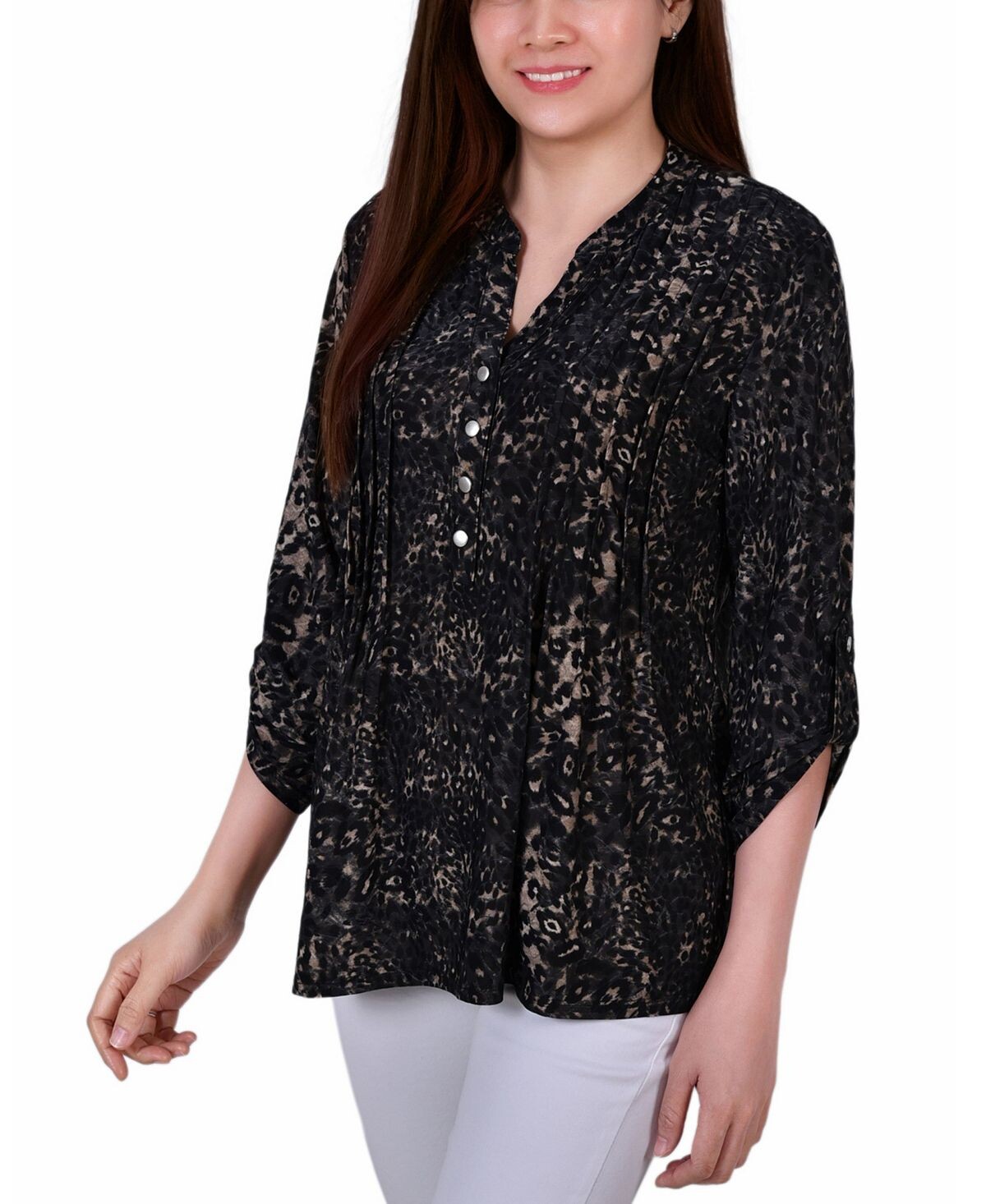 Этот топ из коллекции NY с рукавами длиной 3/4 и застежкой на пуговицы подойдет любой женщине.