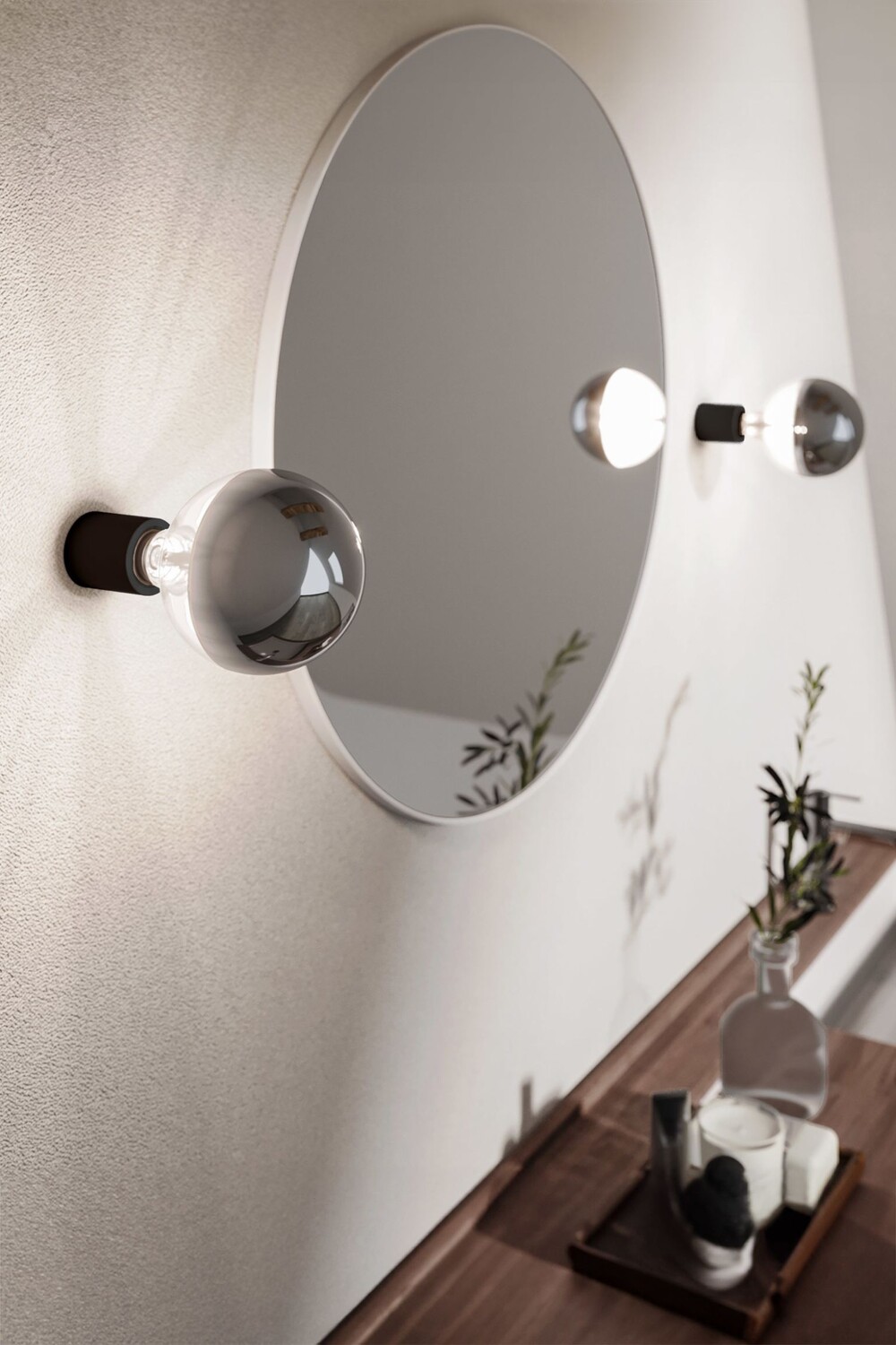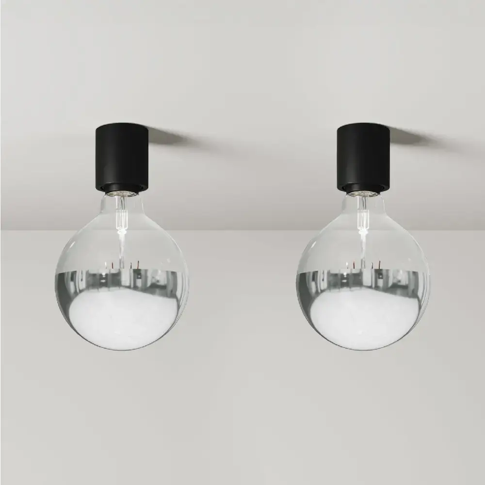 Набор из двух минималистичных настенных и потолочных светильников. Патрон лампы IP44 с резьбой E27. В комплект входит лампочка Silver Half Sphere мощностью 7 Вт 750 Лм. Диаметр патрона лампочки 5 см. Высота 6 см. Общая длина примерно 21 см.