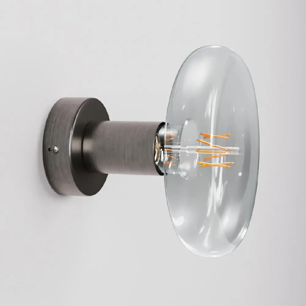 Настенный и потолочный светильник из матового титана. Патрон лампы с резьбой Е27. В комплект входит лампочка мощностью 6Вт 610Лм. Диаметр 12 см. Общая высота около 16 см.