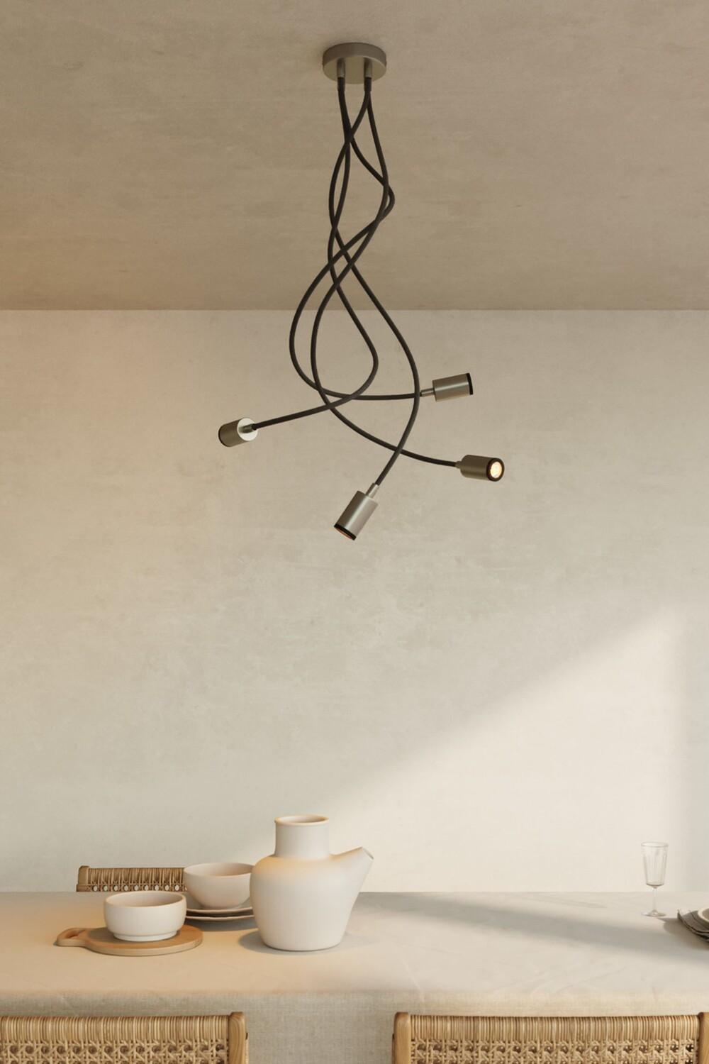 Серый потолочный светильник с отделкой из матового титана. Гибкие дужки с льняной оплеткой направляют свет туда, где он необходим. Патрон лампы с резьбой GU10. В комплект входят отражатели мощностью 3,2 Вт, 260 Лм. Диаметр 12 см. Длина ручки 90 см.