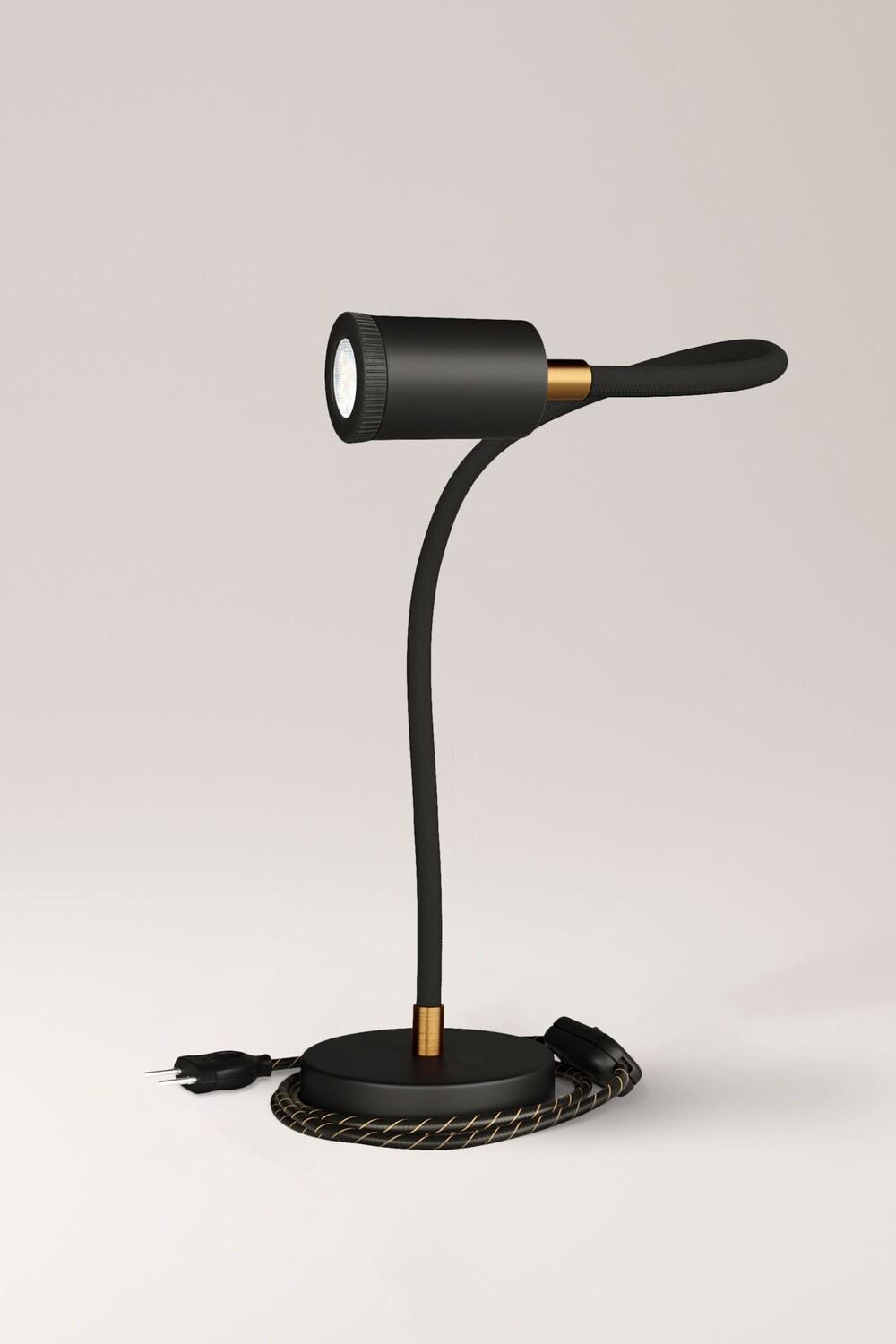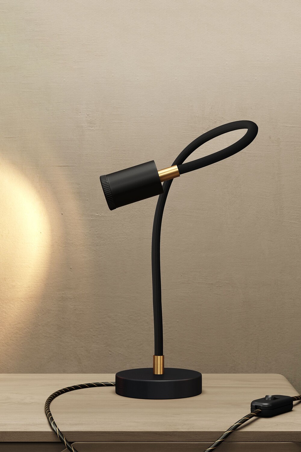 Настольная лампа с отражателем черного цвета и матовой бронзы. Используя гибкий кронштейн, вы можете направить свет туда, где он необходим. Плетеный кабель и пластиковый переключатель. Патрон лампы GU10. В комплект входит лампочка мощностью 3,2 Вт мощностью 260 Лм. Ширина основания 12 см. Длина руки 60 см. Длина кабеля 180 см.