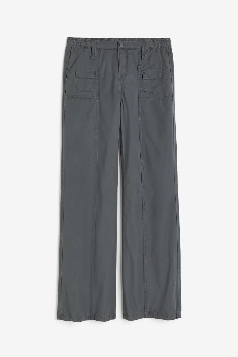 Брюки-карго из хлопкового полотна. Низкий пояс с закрытой резинкой сзади и по бокам, а также молния и кнопка. Наклонные боковые карманы, оба с дополнительным небольшим карманом с клапаном. Брюки прямые, со складками спереди и сзади. Длина: Длинная. Рост: Заниженная талия. Посадка: Классический крой. Стиль: Карго, Прямые штанины. Состав. Хлопок 100%. Дополнительная информация о материале. Общий вес данного изделия включает в себя: 20% переработанного хлопка. Вес мелких деталей, таких как нитки, пуговицы, молнии, украшения и принты, не учитывается. Общий вес изделия рассчитывается путем сложения вес всех слоев и основных комплектующих. На основании этого рассчитываем, какая часть этого веса приходится на каждый материал. Для расчетов комплектов и мультиупаковок все детали считаются вместе как одно изделие. Материал: Хлопок, Холст.