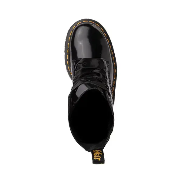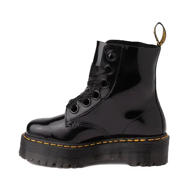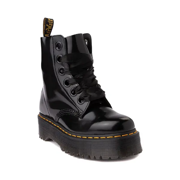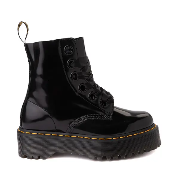 Добавьте немного гламура в свой стиль панк-рока с новыми ботинками Molly от Dr. Martens! Эти ботинки с массивной подошвой на платформе имеют верх из атласной блестящей кожи с большими люверсами, объемными ленточными шнурками и фирменным комфортом Docs на подошве из ПВХ с воздушной подушкой.