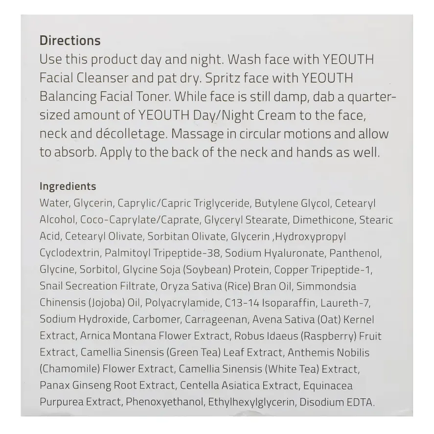 Используйте этот продукт днем и ночью. Умойте лицо очищающим средством для лица Yeouth и высушите. Сбрызните лицо балансирующим тоником для лица Yeouth. Пока лицо еще влажное, нанесите четверть размера дневного/ночного крема Yeouth на лицо, шею и декольте. Помассируйте круговыми движениями и дайте впитаться. Нанесите на заднюю часть шеи и руки, а также.