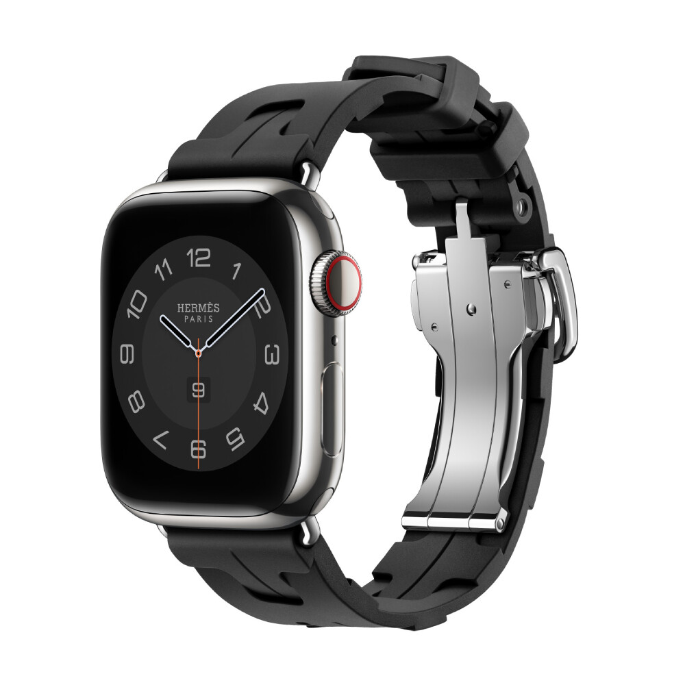 Самый спортивный ремешок Hermès на сегодняшний день. Kilim, изготовленный из мягкой водонепроницаемой формованной резины с рисунком H, оснащен удобной застежкой, которая открывается легким щелчком.