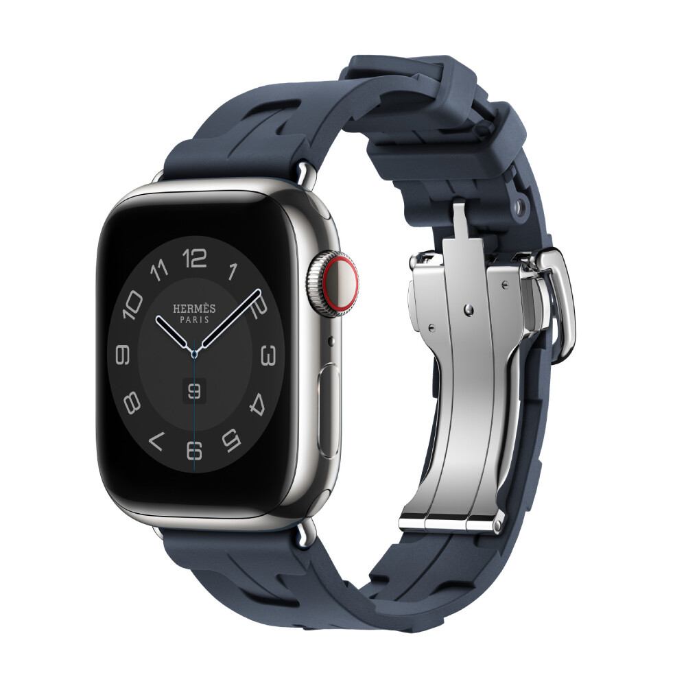 Самый спортивный ремешок Hermès на сегодняшний день. Kilim, изготовленный из мягкой водонепроницаемой формованной резины с рисунком H, оснащен удобной застежкой, которая открывается легким щелчком.