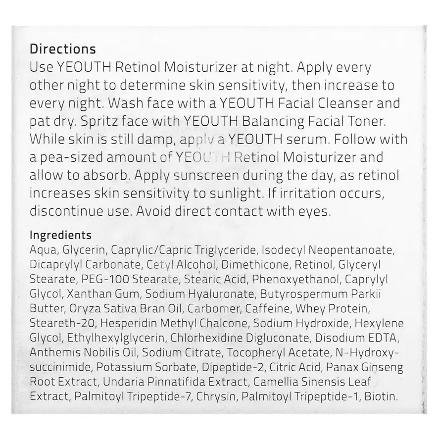 Используйте увлажняющий крем YEOUTH с ретинолом на ночь. Наносите каждую вторую ночь, чтобы определить чувствительность кожи, затем увеличивайте до каждой ночи. Умойте лицо очищающим средством для лица YEOUTH и высушите. Сбрызните лицо балансирующим тоником для лица YEOUTH. Пока кожа еще влажная, нанесите сыворотку YEOUTH. Затем нанесите увлажняющее средство YEOUTH Retinol Moisturizer размером с горошину и дайте ему впитаться. Наносите солнцезащитный крем в течение дня, так как ретинол повышает чувствительность кожи к солнечному свету.