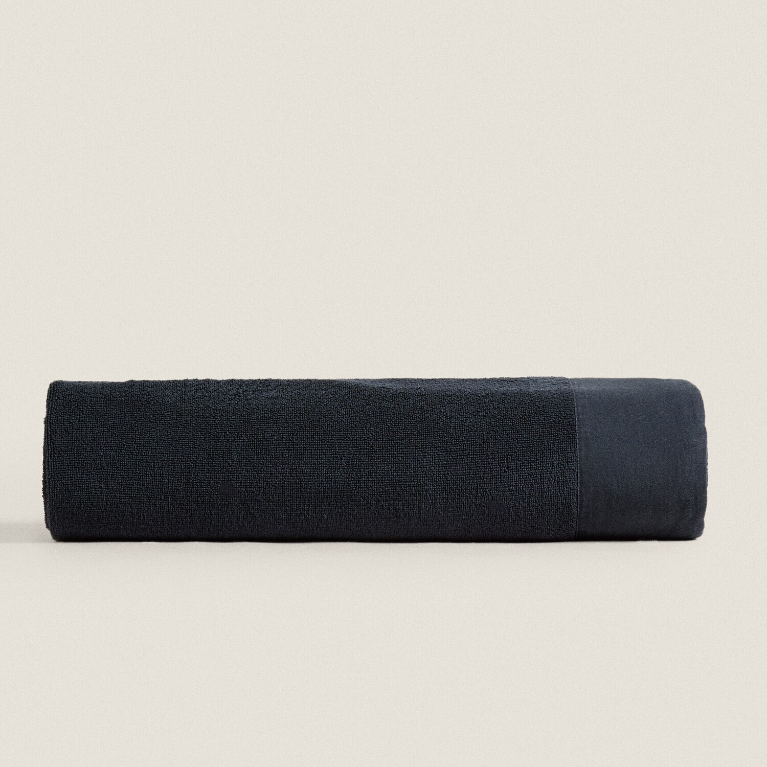 Простое хлопковое махровое банное полотенце с льняной каймой в тон по краям.