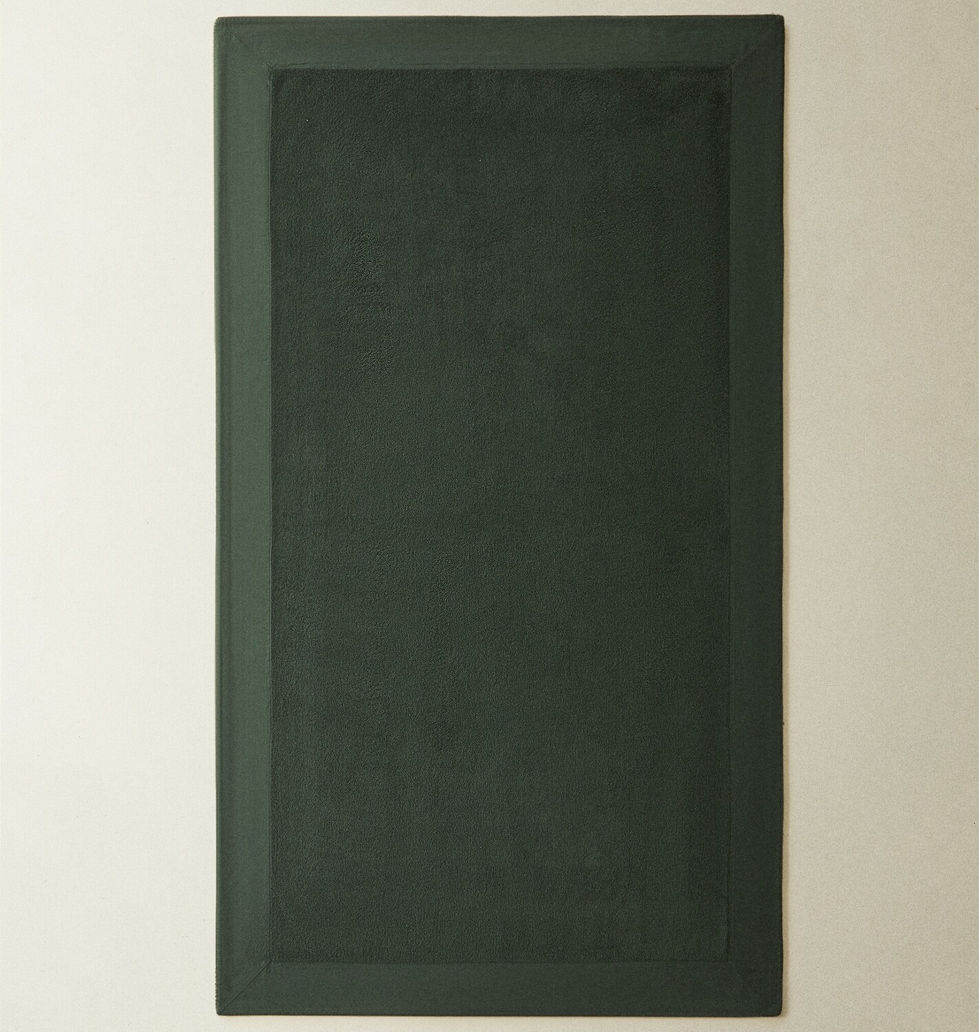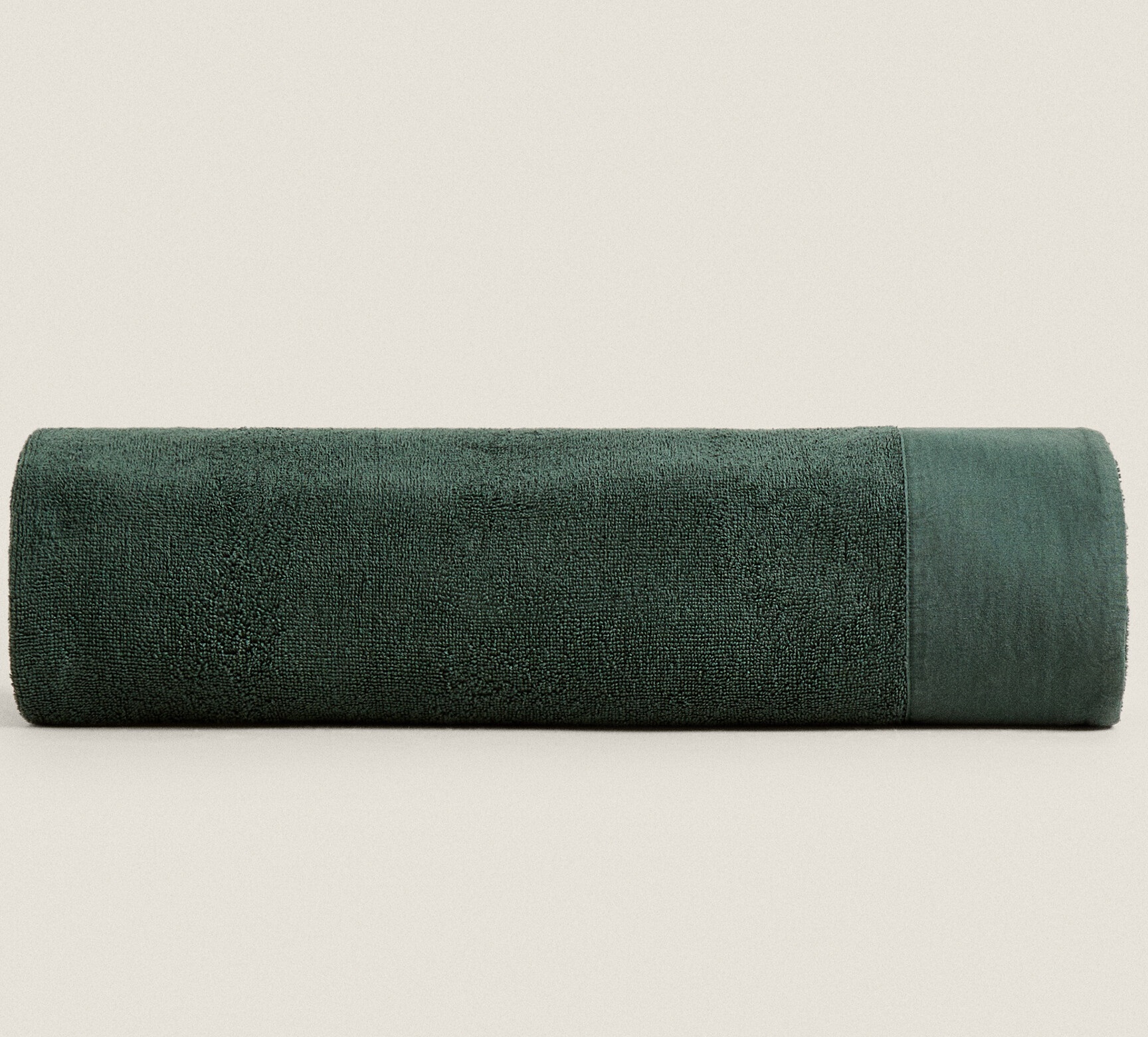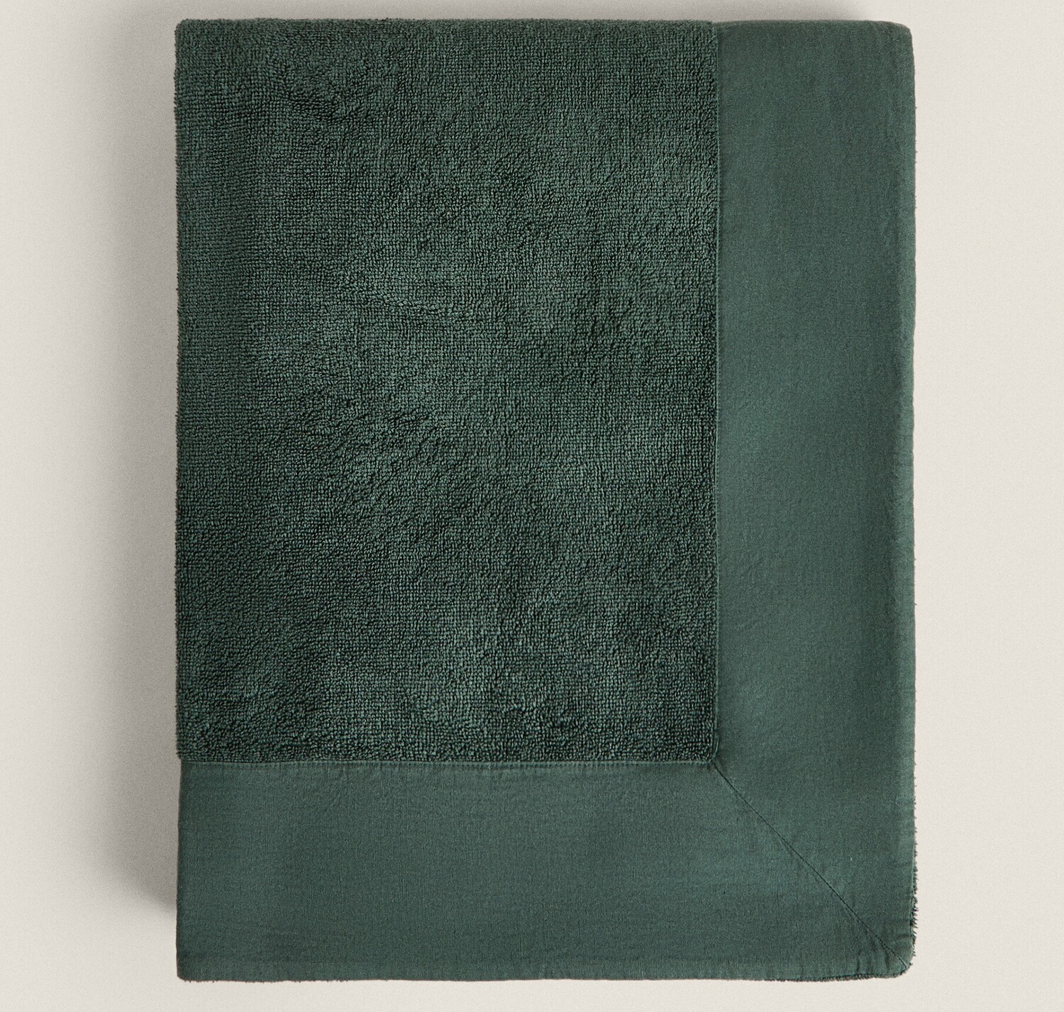 Простое хлопковое махровое банное полотенце с льняной каймой в тон по краям.