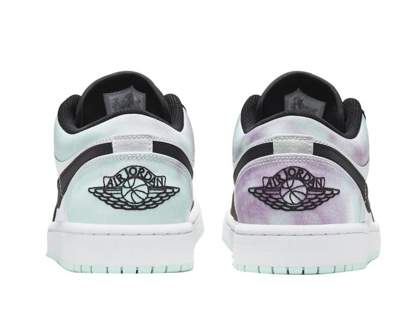 Любимая модель 1985 года представлена в палитре тай-дай Air Jordan 1 Low SE «Tie Dye». Традиционная цветовая блокировка «Black Toe» образует фон с белой основой и накладками в передней части стопы, а также логотипом Swoosh черного цвета. Накладка на пятку украшена узором, который чередуется от цвета синего цвета слева до лаванды справа, оба варианта сопровождаются вышитым логотипом Wings. Резиновая подошва ярко-лилового цвета обеспечивает надежное сцепление с поверхностью.