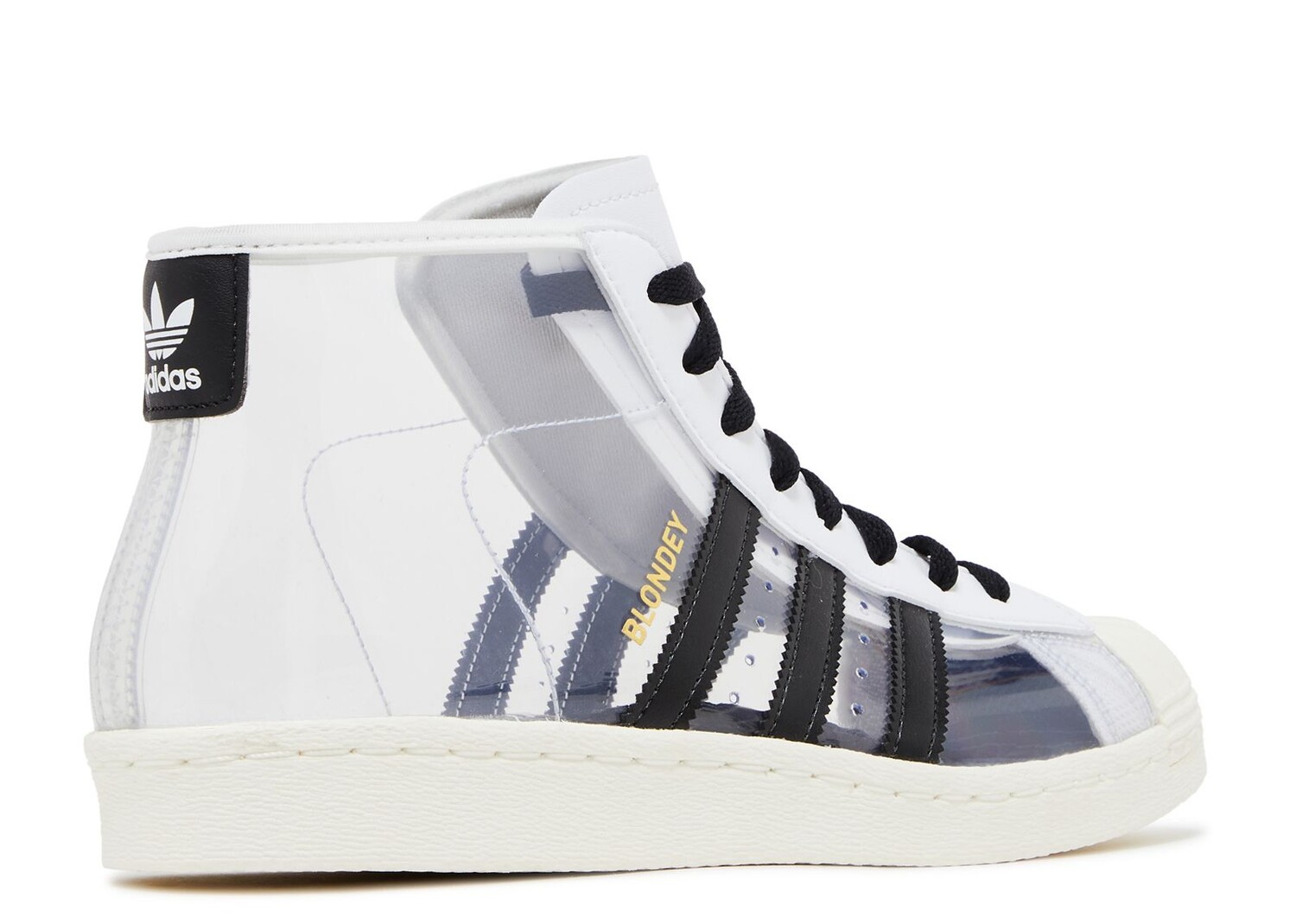 Модель Blondey McCoy x adidas Pro ADV «Clear» выделяется уникальным полупрозрачным верхом из ТПУ, закрепленным традиционной кружевной застежкой, язычком на спине с логотипом трилистника и фирменными тремя полосками из черной синтетической кожи. Оставаясь верными своему наследию, обувь имеет культовый резиновый носок-ракушку, белую резиновую подошву с прошитыми боковинами и подошву с рисунком «елочка».