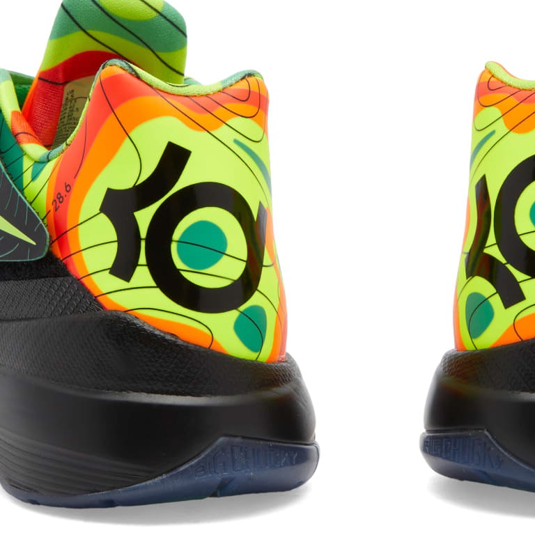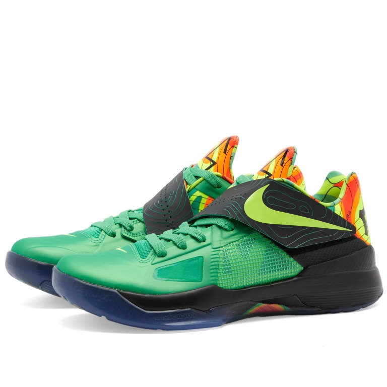 Эта версия Nike Zoom KD 4 «Weatherman» 2024 года, выпущенная в 2011 году, имеет ярко-зеленый верх из сетки с плавлеными накладками. Топографические линии охватывают ремешок Adaptive Fit, а красочная карта погоды охватывает подкладку и область пятки. На левой стельке есть фраза: «Прогноз обещает грозу». Эти кроссовки имеют черную межподошву Phylon во всю длину и вставку Zoom Air в передней части стопы, обеспечивающую отзывчивость. Мотив карты погоды снова бросается в глаза, на этот раз под ногами, украшая резиновую подошву.