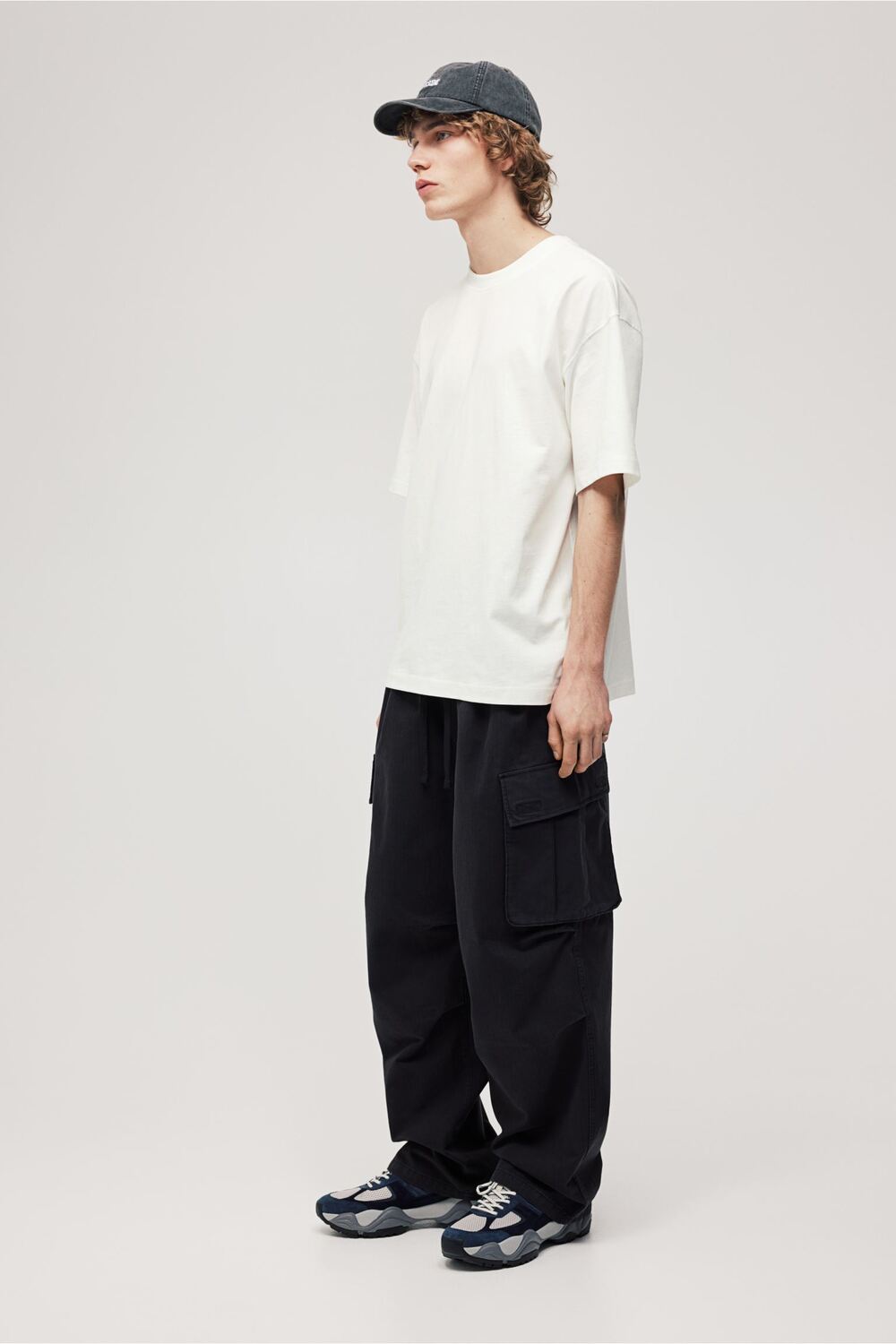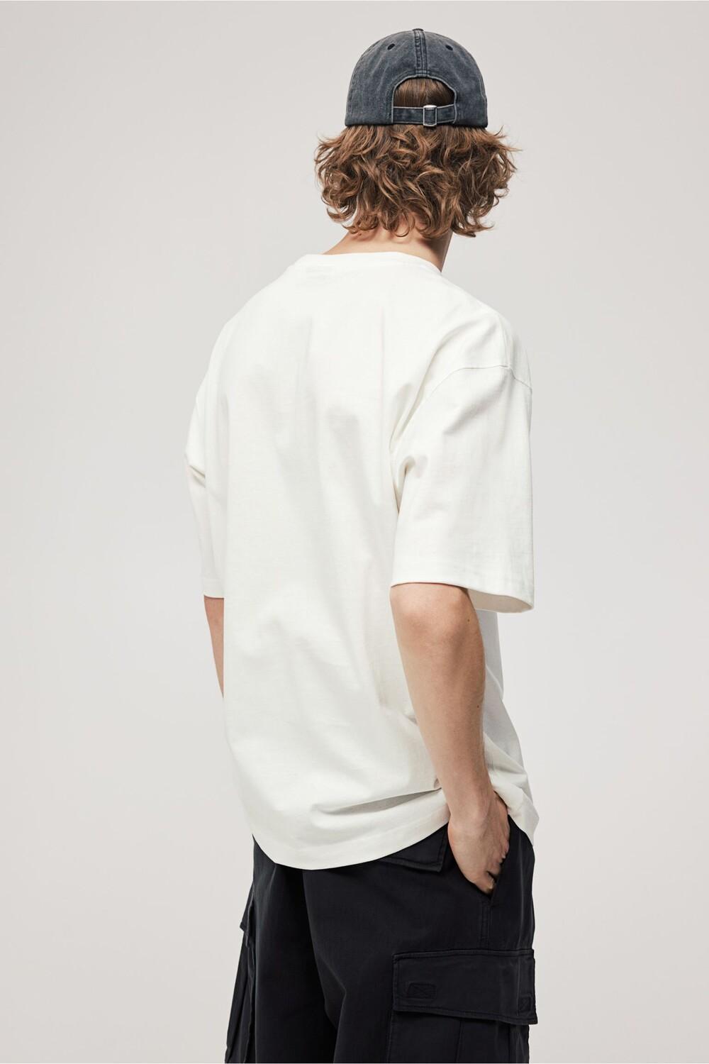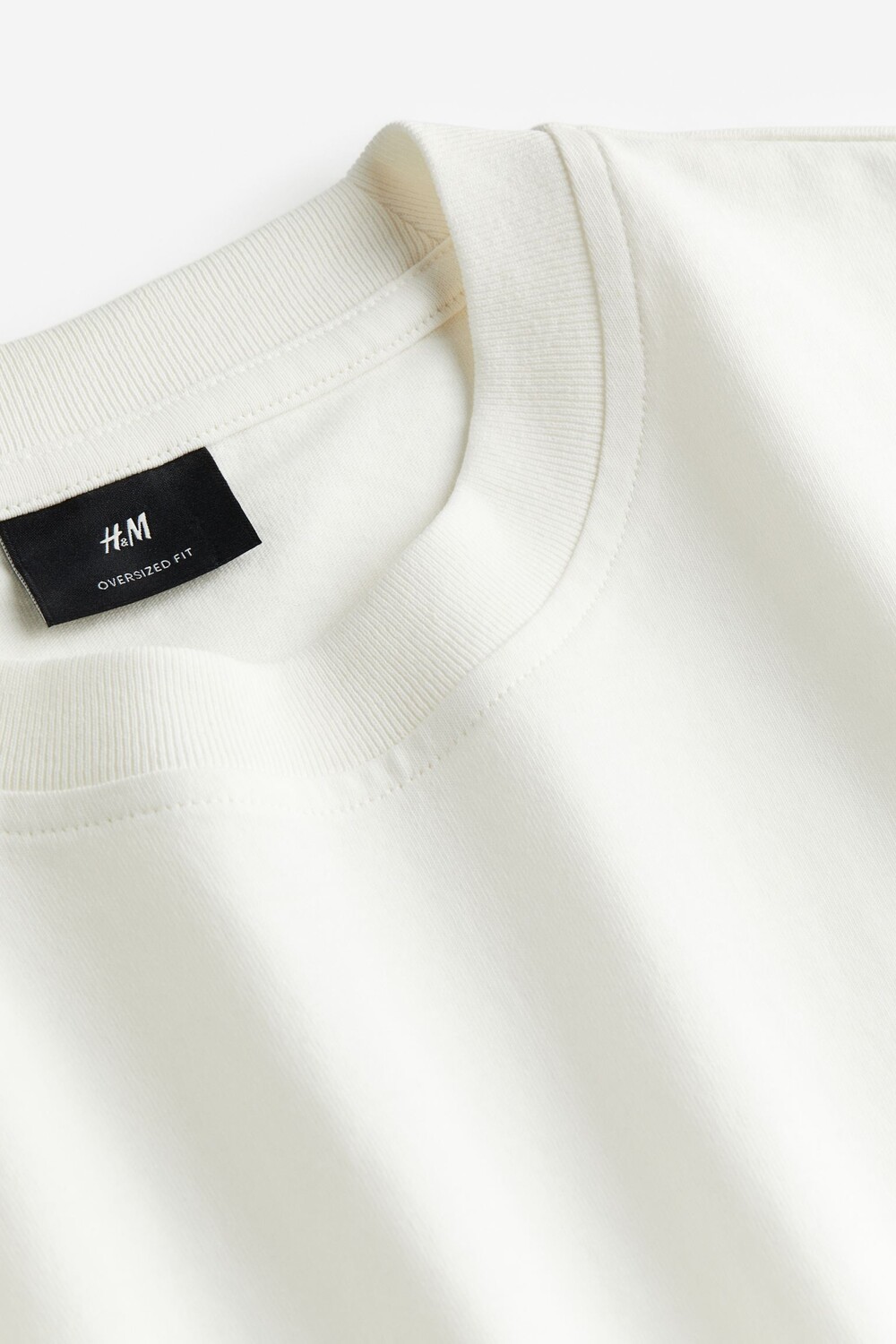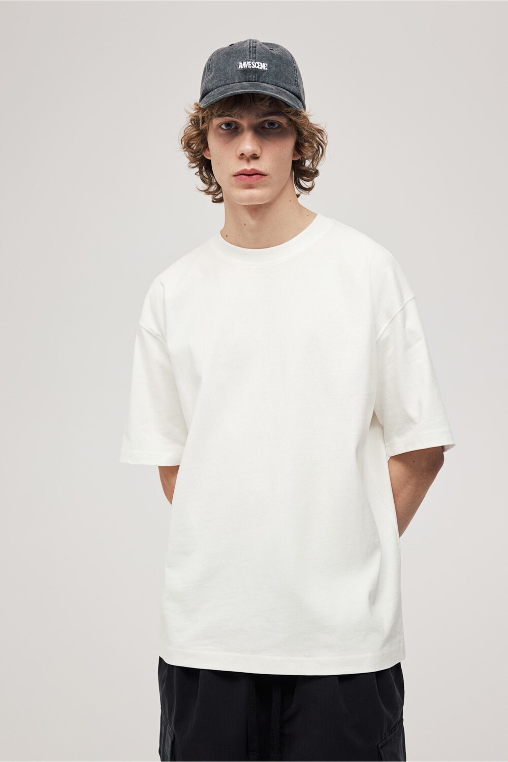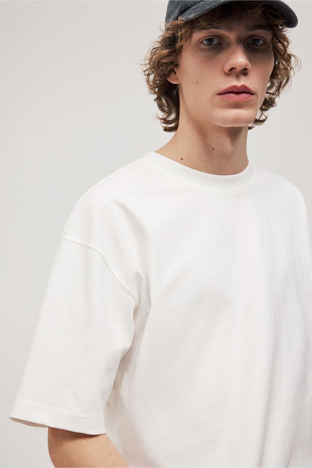Футболка оверсайз из плотного хлопкового трикотажа с круглым вырезом горловины с отделкой в рубчик, заниженной линией плеч и прямым краем по низу.
