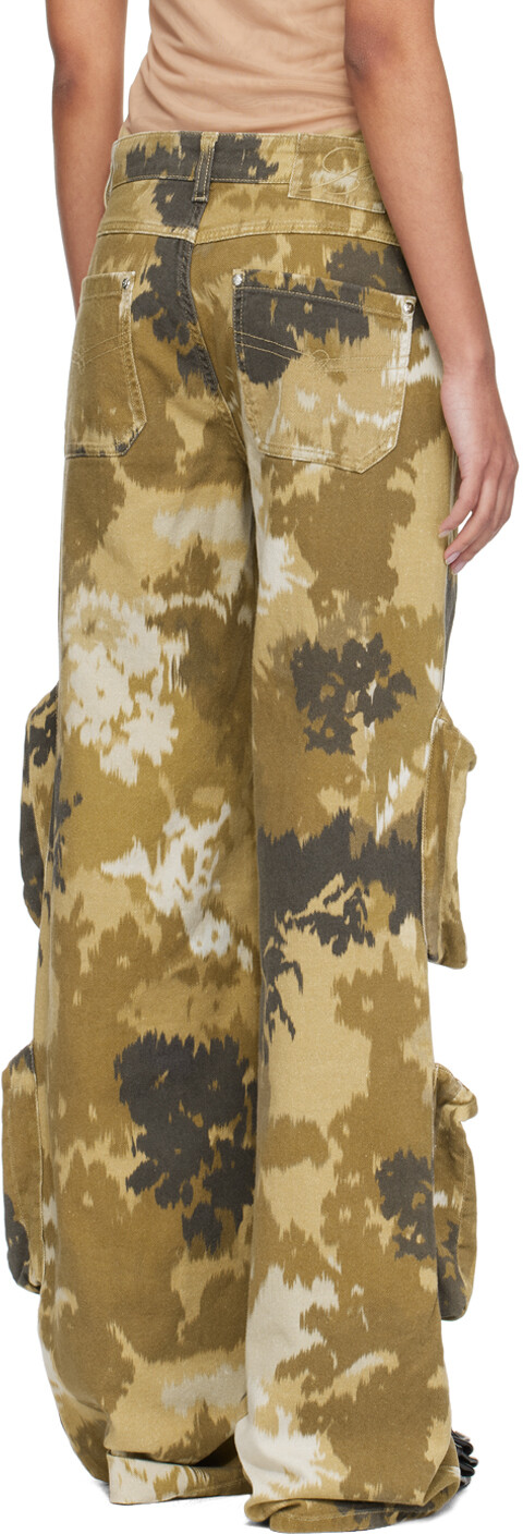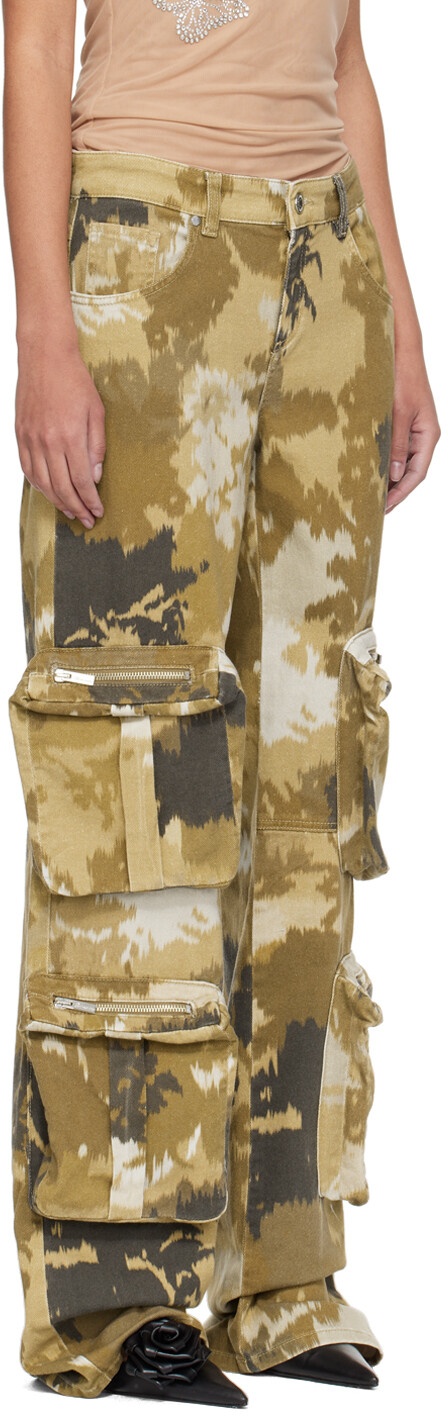 Коричневые джинсовые брюки-карго с камуфляжным принтом. Широкие брюки карго из эластичного денима ручной работы. Напечатан камуфляжный узор. Петли для ремня Пять карманов Застежка-молния Карманы на молнии спереди Нашивка с логотипом на поясе сзади Серебристая фурнитура с выгравированным логотипом Поставщик цвет: Camoscio/Amphor Основная часть: 98 % хлопок, 2 % эластан. Подкладка: 100% хлопок. Сделано в Албании. 241901F087004