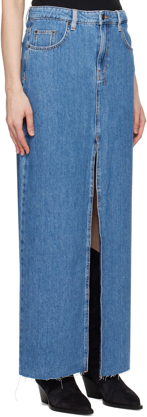 Синяя джинсовая длинная юбка Kara. Легкая юбка из неэластичного денима. Потертость по всей поверхности. Низкая посадка Петли для ремня Пять карманов Молния Центральная шлица спереди Необработанный край по низу Вышитая графика сзади >Съемная текстильная бирка на заднем кармане Фурнитура бронзового цвета с выгравированным логотипом Контрастная коричневая строчка Цвет поставщика: наследие темно-синего цвета 100% хлопок. Сделано в Турции. 241088F093001