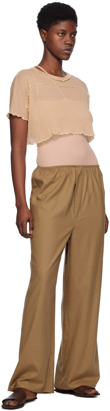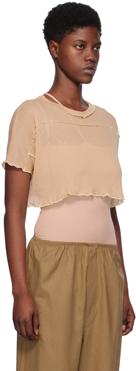 Бежевая укороченная футболка Sun. Полупрозрачная футболка из джерси из органического хлопка. Сертифицированы GOTS, OEKO-TEX® и OCS 100. Конструкция с панелями Открытые швы по всей поверхности Вырез-лодочка Укороченная кромка по краю салата.Цвет поставщика: Розовый верблюжий 100% органический хлопок. Сделано в Португалии.