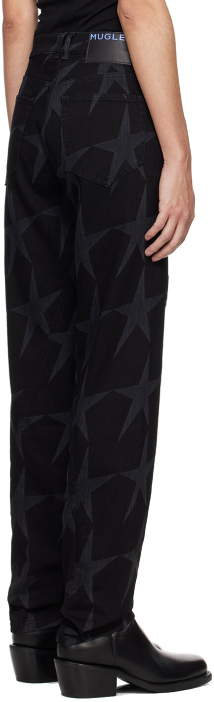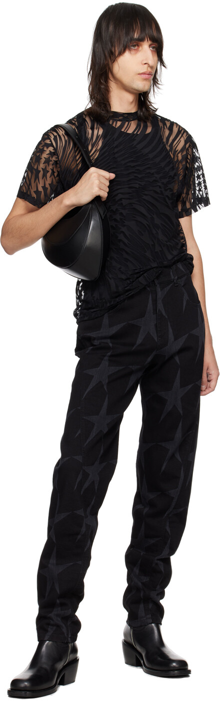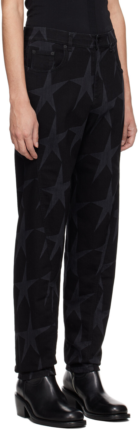 Черные джинсы со звездами. Джинсы из эластичного денима свободного кроя. Графический узор, напечатанный лазером по всей поверхности. Завышенная посадка Петли для ремня Пять карманов Застежка-молния Перекрученные внешние швы Нашивка с логотипом на поясе сзади Выгравированный логотип Фурнитура цвета бронзы. Цвет поставщика: Black Star. 98 % хлопок, 2 % эластан. Сделано в Италии.
