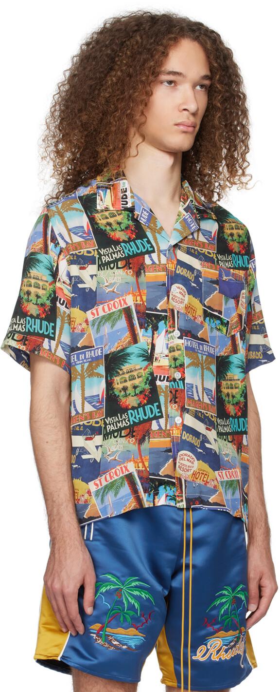 Синяя рубашка с принтом. Рубашка из шелкового атласа. Графический рисунок с логотипом напечатан по всей поверхности.