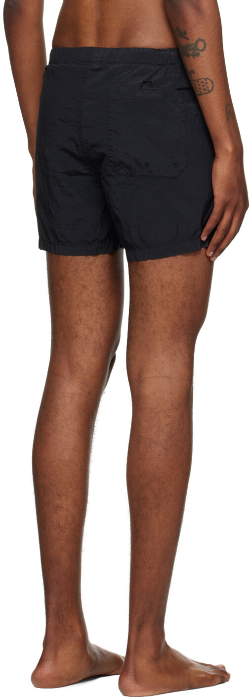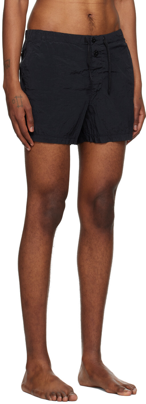 Черные жатые шорты для плавания. Окрашенные в готовом виде мятые шорты из переработанной нейлоновой тафты ECONYL®. Кулиска на эластичном поясе Три кармана Пуговица Нашивка с логотипом на передней части штанин Отделка из репсовой ткани по внешним швам >Частичная сетчатая подкладка-бриф Цвет поставщика: Черный Код поставщика: 8015B0943 100% полиамид. Сделано в Индонезии. 241828M193087