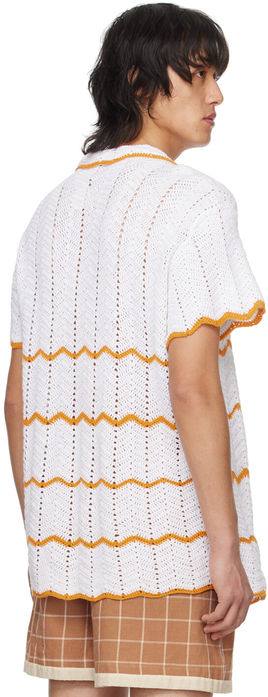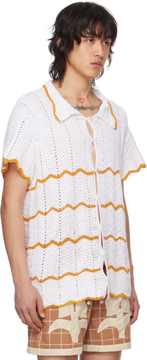 Белая рубашка с шевроном. Рубашка из хлопка, связанная вручную крючком. Узор шеврон и полосы по всей поверхности.