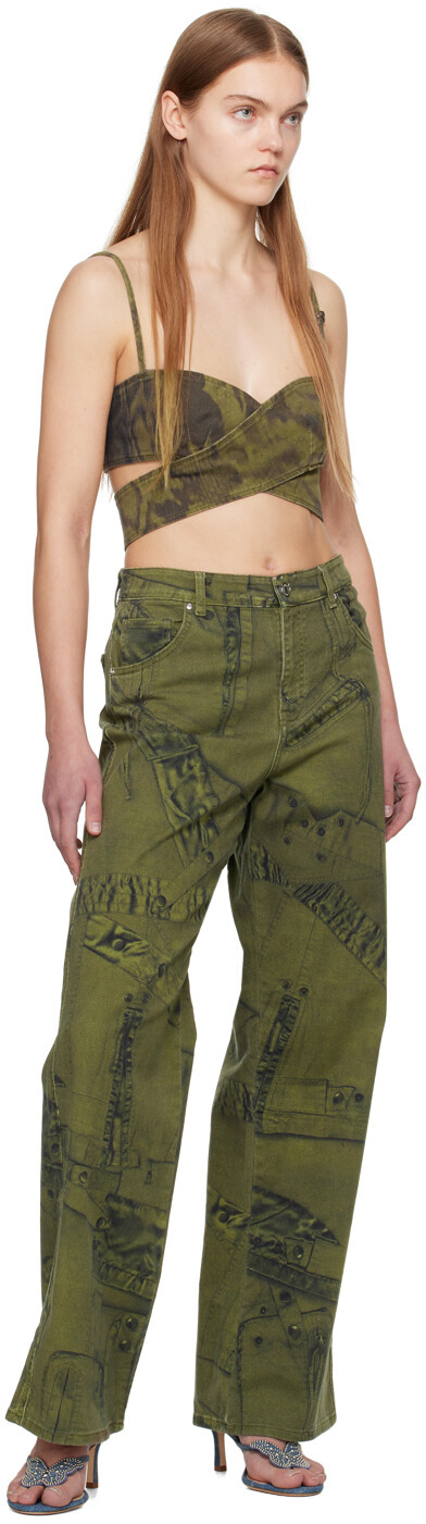 Майка цвета хаки с запахом. Майка из эластичного хлопкового твила ручной работы. Графический рисунок нанесен по всей поверхности.