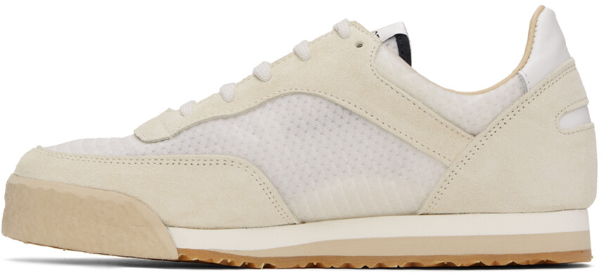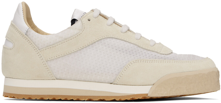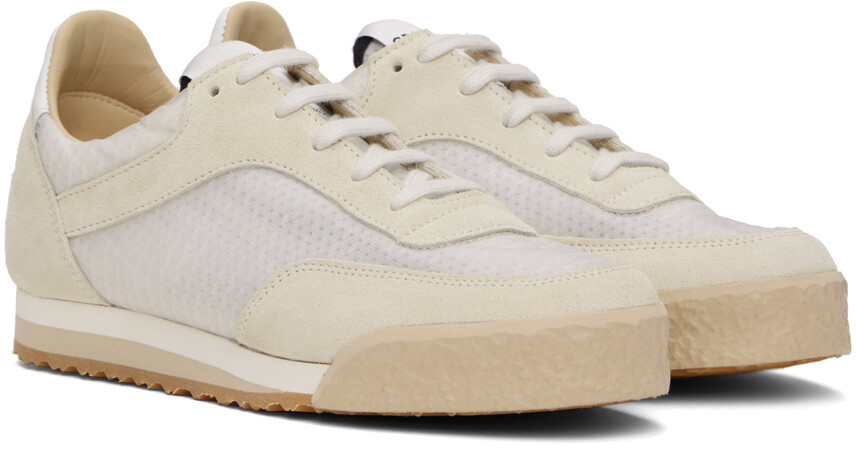 Бело-бежевые низкие кеды. Низкие кроссовки из замши и полупрозрачного рипстопа белого и бежевого цвета. Шнуровка Нашивка с логотипом на язычке Мягкий воротник Зернистая телячья кожа и подкладка из сетки Подошва из пенорезины >Резиновая подошва с протекторомЦвет поставщика: Белый Верх: текстиль, кожа. Подошва: резина. Производство Словакия (Словацкая Республика).