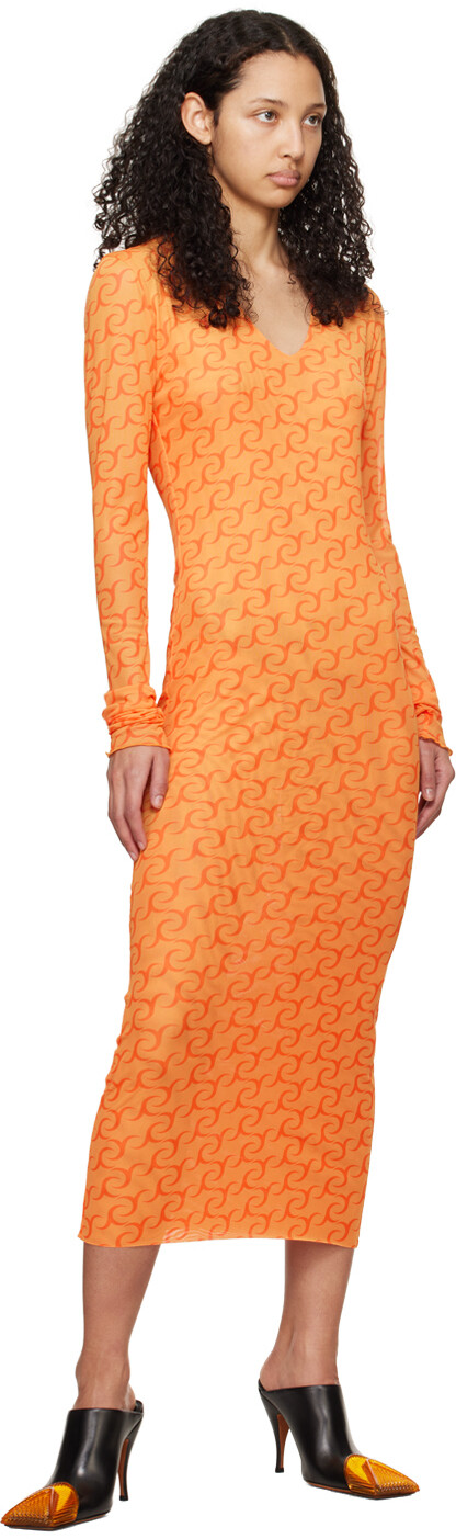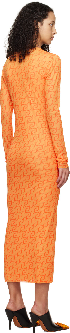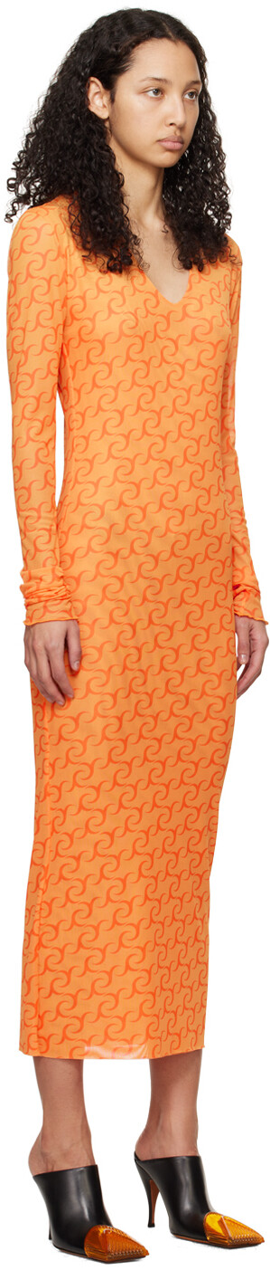 Оранжевое платье-миди с принтом. Платье из полупрозрачной эластичной полиэстеровой сетки. Логотип напечатан по всей поверхности.