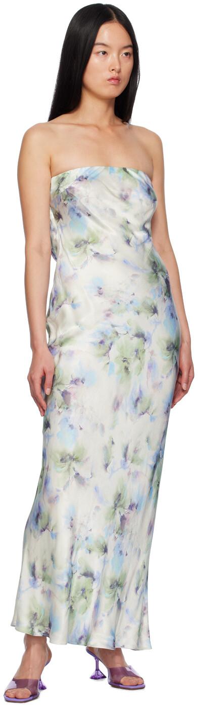 Белоснежное платье макси Moondance. Платье косого кроя из вискозного чеканного атласа. Напечатанный по всей поверхности цветочный узор.