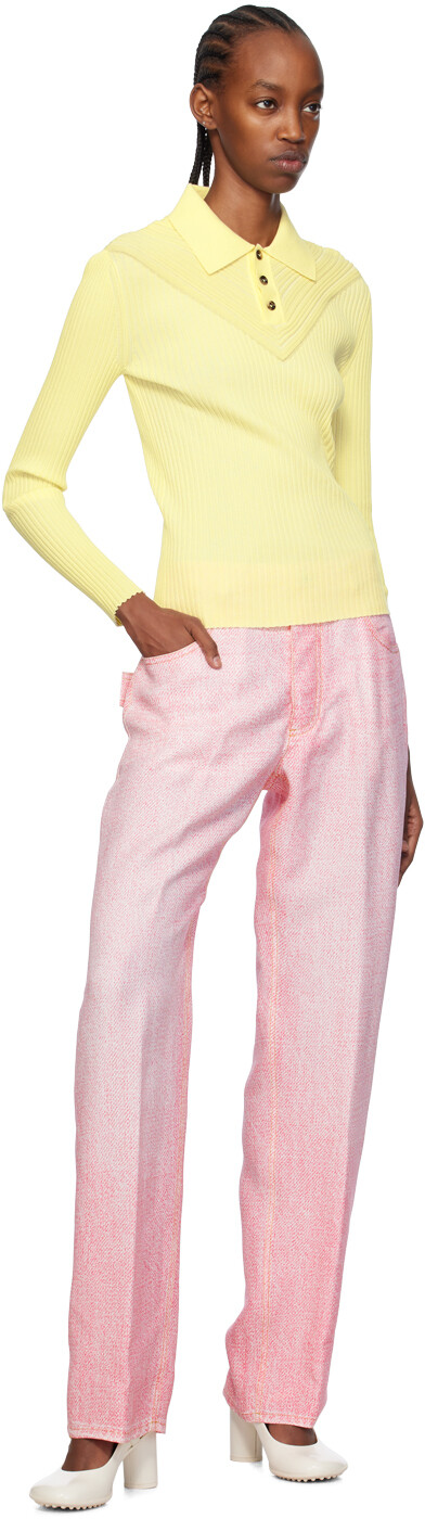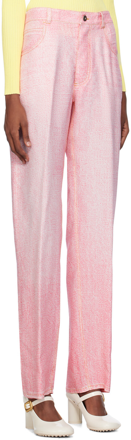 Розово-белые брюки с принтом. Прямые брюки из твила с добавлением вискозы и шелка. Принт с эффектом Trompe-L'œil. Петли для ремня Четыре кармана Пуговицы Складчатые штанины Кожаная нашивка с логотипом на заднем поясе Петля-молоток на заднем накладном кармане Контрастная строчка желто-коричневого цвета. Цвет поставщика: Розовый/Белый. Основная часть: 92% вискоза, 8% шелк. Подкладка: 100% вискоза. Сделано в Италии. 241798F087001