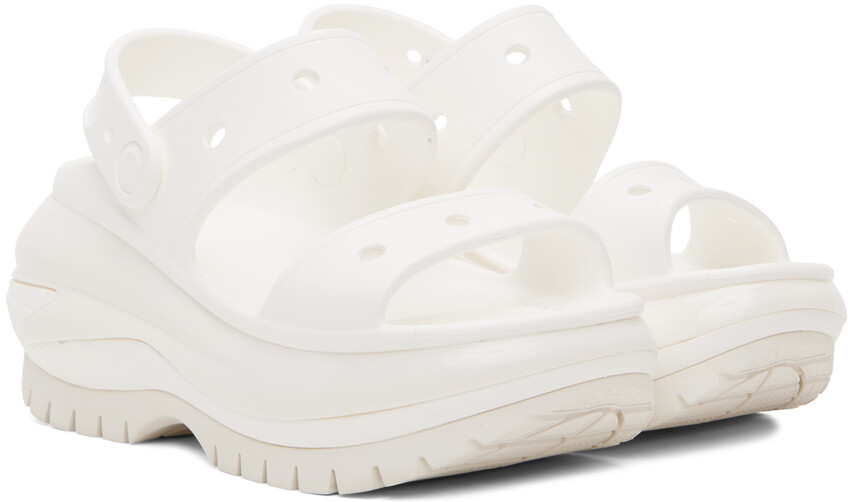Белые сандалии Mega Crush. Легкие сандалии из пенорезины белого цвета. Открытый носок Перфорированная деталь на союзке Ремешок с тисненым логотипом на пятке Тихий логотип на пятке Формованная резиновая стелька Скульптурная межподошва из пенорезины на платформе Резиновая подошва с рисунком Платформа: H2,5" Цвет поставщика: Белая резина. Сделано во Вьетнаме. 241209F124015