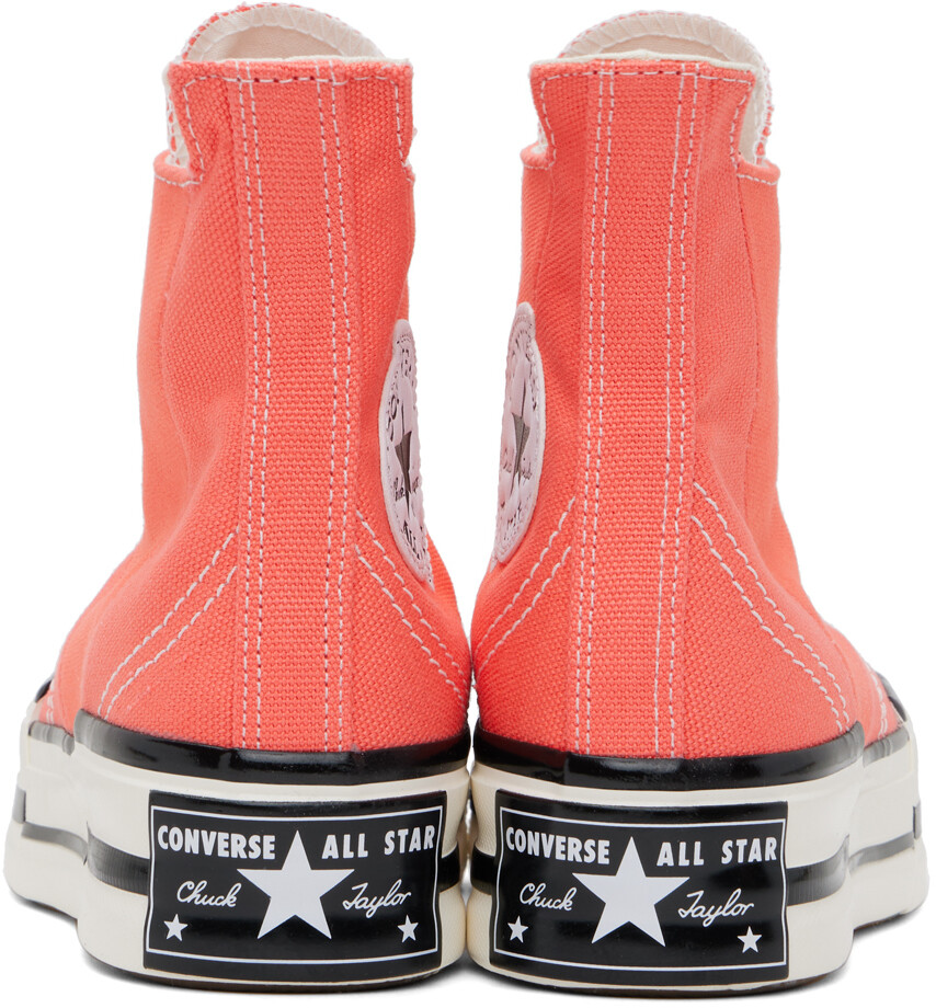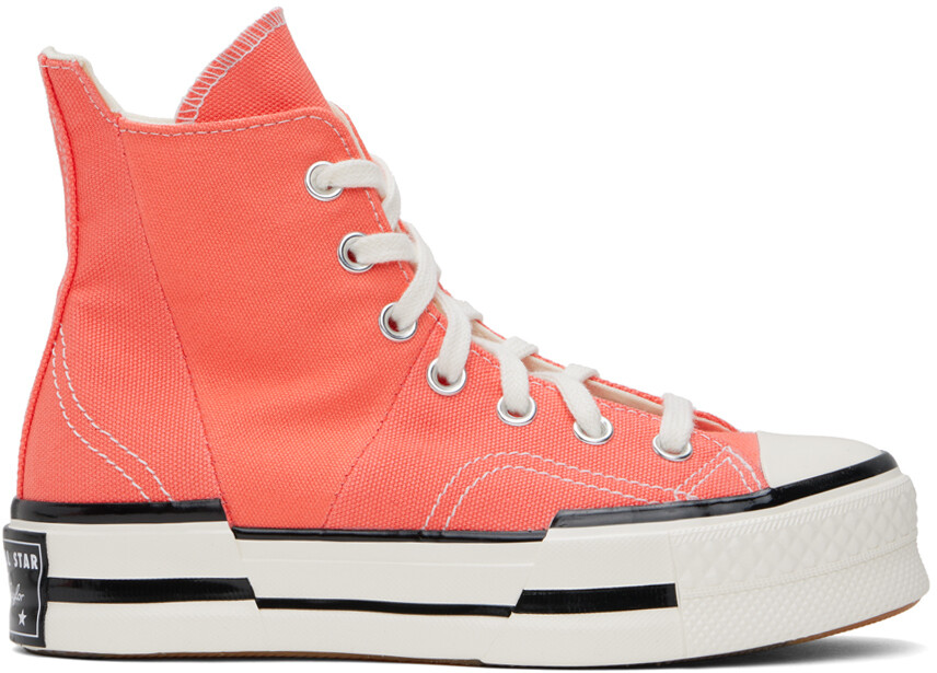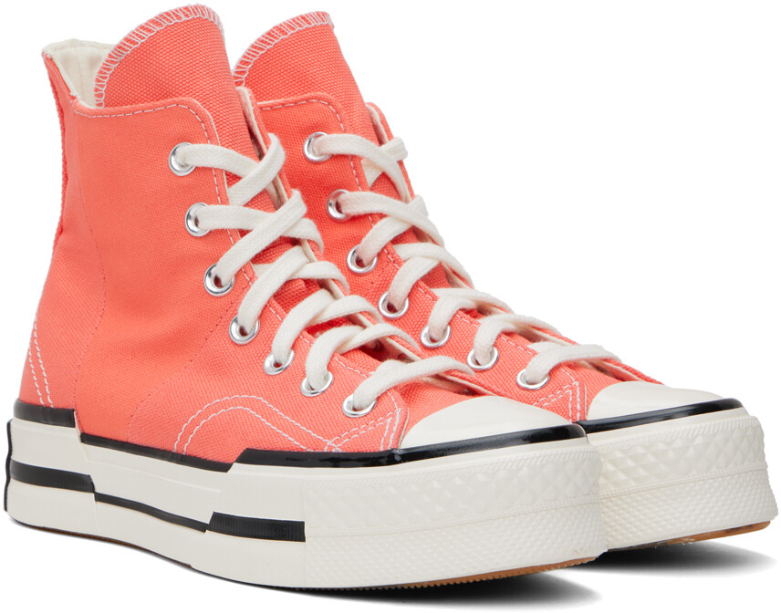 Розовые кроссовки Chuck 70 Plus. Высокие кроссовки из парусины розового цвета. Резиновый носок Шнуровка Удлиненный язычок и пятка Нашивка с логотипом и люверсы на внутренней стороне Мягкая стелька OrthoLite® Прорезиненная нашивка с логотипом на пятке Резиновая подошва с рисунком Контрастная строчка белого цветаЦвет поставщика: «Арбузный слякоть»/Белый/Черный Верх: текстиль. Подошва: резина. Сделано во Вьетнаме.