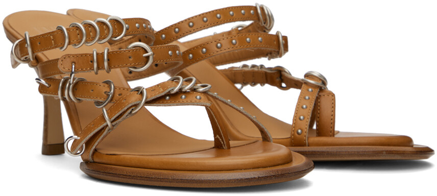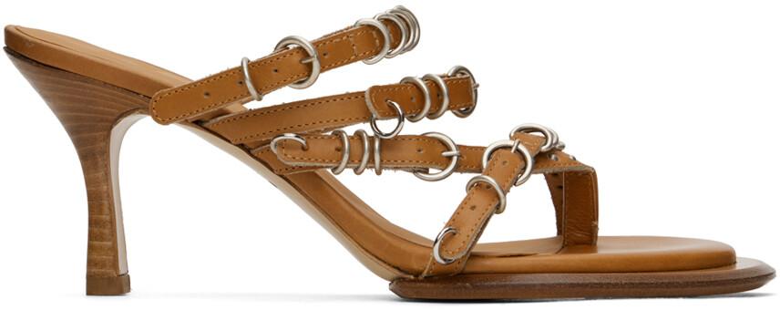 Эксклюзивные коричневые сандалии SSENSE Scythe. Светло-коричневые босоножки на каблуке ручной работы из полированной кожи. Уплотнительные кольца, потертости и заклепки по всей поверхности Открытый носок Ремешки с пряжками на союзке Бюкс на шпильке с резиновыми вставками Подошва из полированной кожи Каблучок: H3"Доступно исключительно в SSENSE. Цвет поставщика: Светло-коричневый. Сделано в Италии.