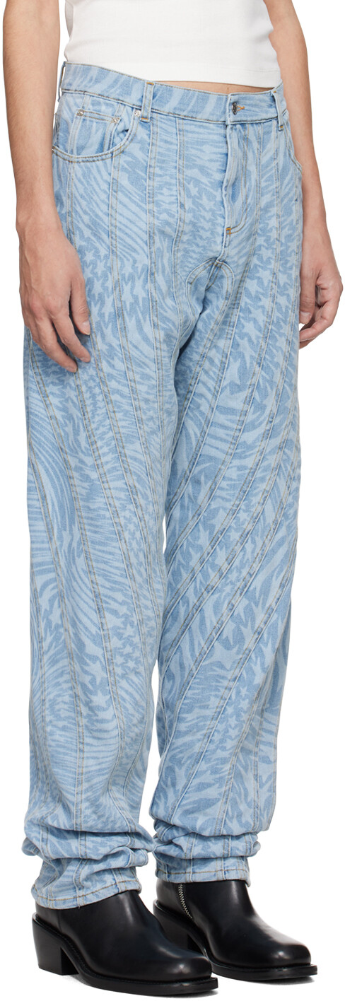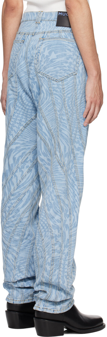 Синие джинсы со звездами. Джинсы из эластичного денима свободного кроя. Графический узор, напечатанный лазером по всей поверхности. Конструкция со вставками Петли для ремня Пять карманов Застежка-молния Перекрученные внешние швы Нашивка с логотипом на поясе сзади Серебристая гравировка логотипа -тоновая фурнитура Контрастная строчка коричневого цвета. Цвет поставщика: Звезда с лазерной печатью. 72 % хлопок, 28 % эластомультиэстер. Сделано в Италии.