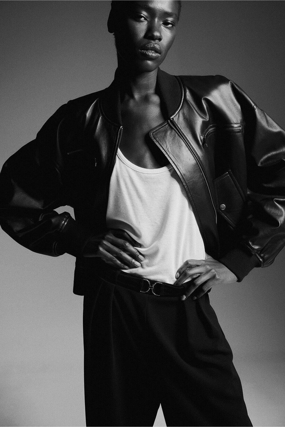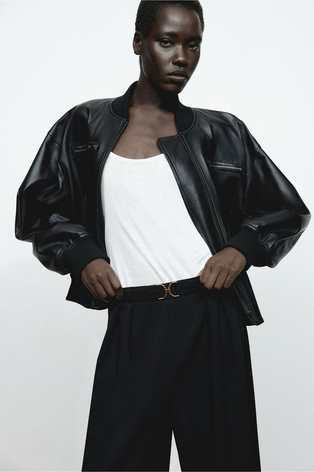 Элегантные брюки из трикотажного крепа. Высокая талия, эластичный пояс и складки спереди. Декоративный ремень с металлической пряжкой. Прямые широкие штанины.