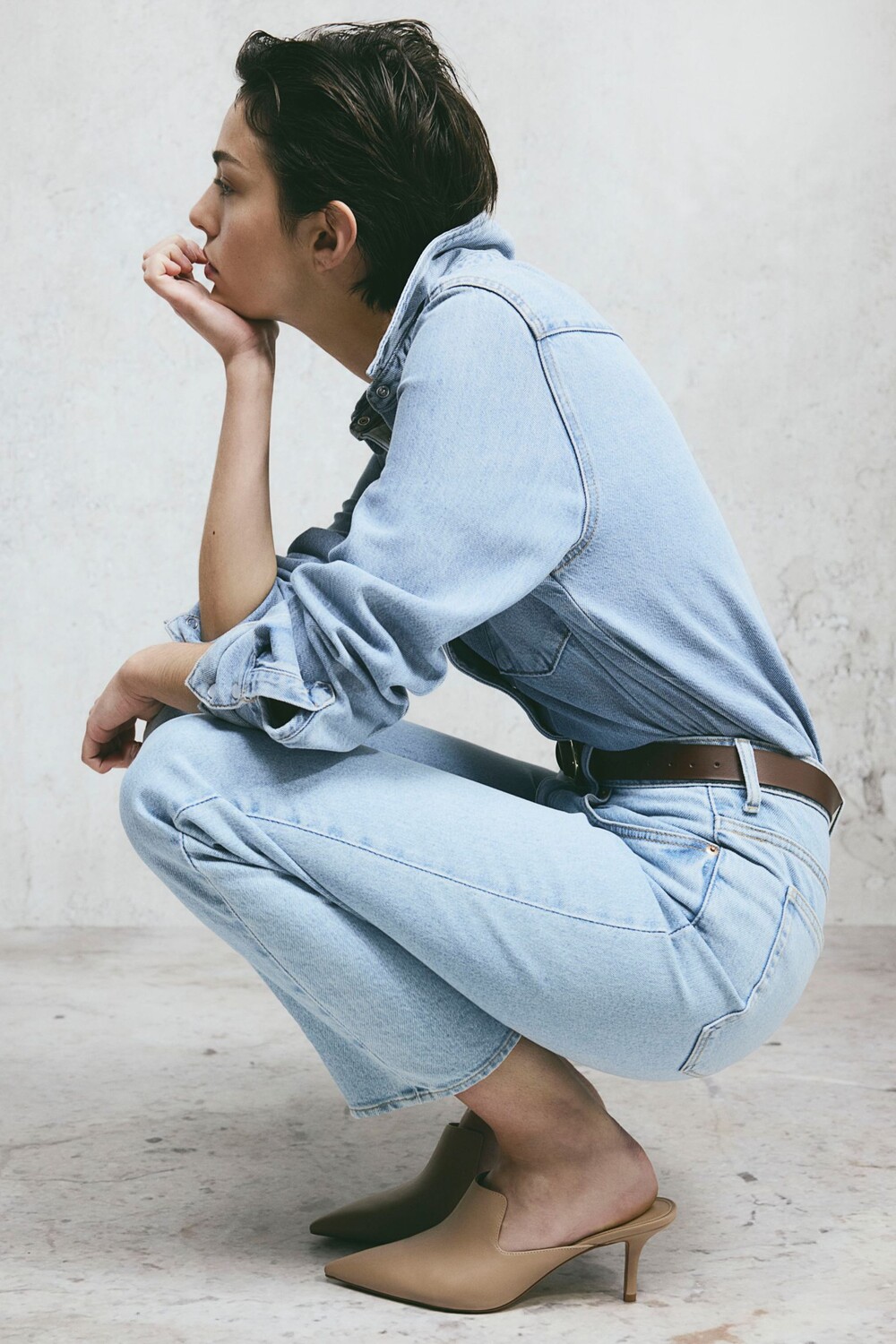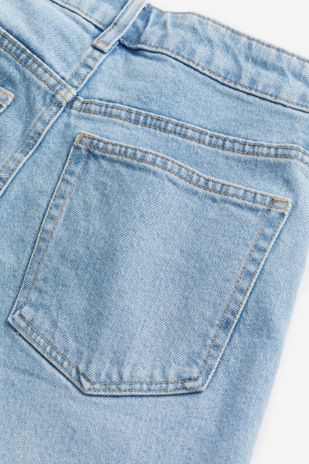 Джинсы с пятью карманами из слегка эластичного хлопкового денима. Узкий крой. Высокая талия, ширинка на молнии и пуговице. Прямые штанины длиной до щиколотки.