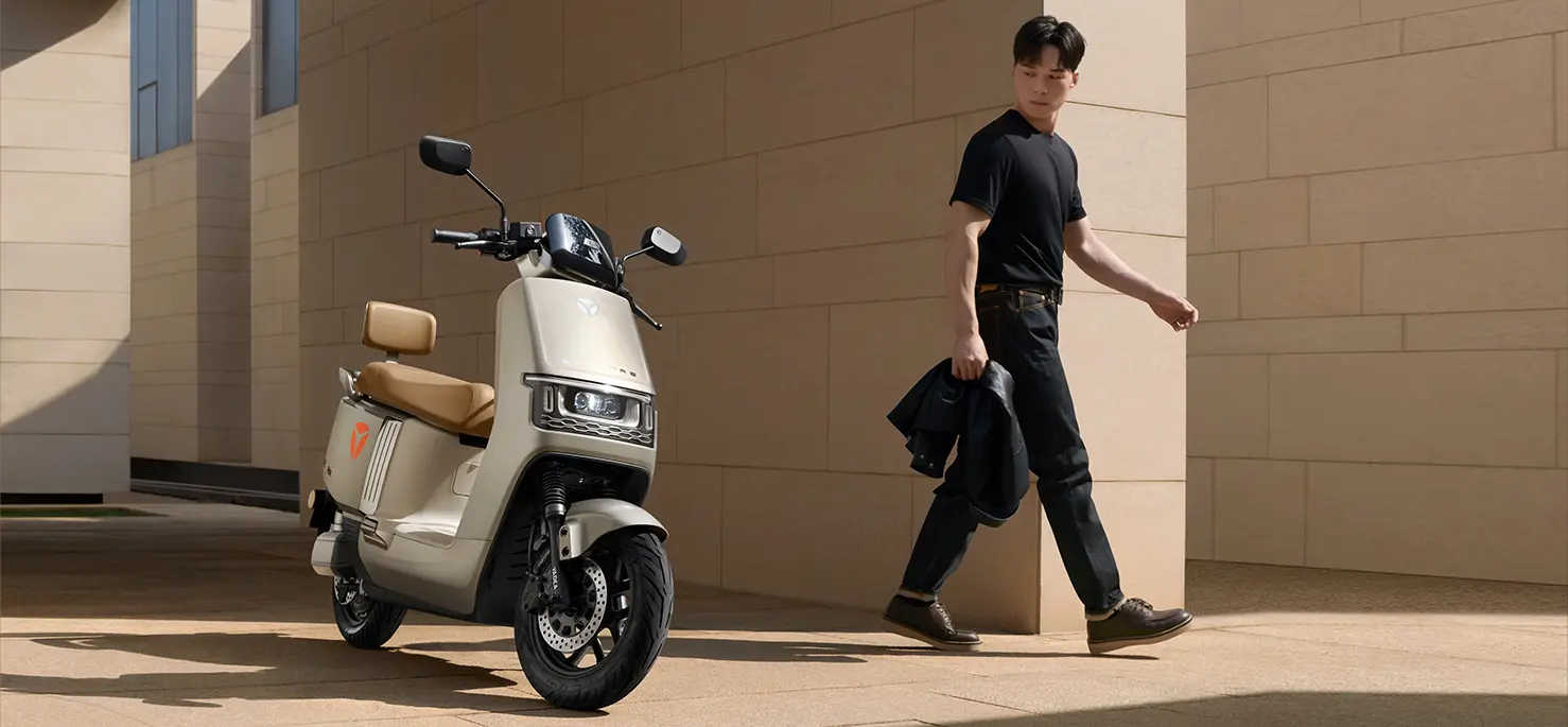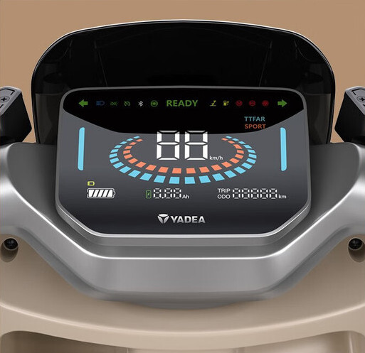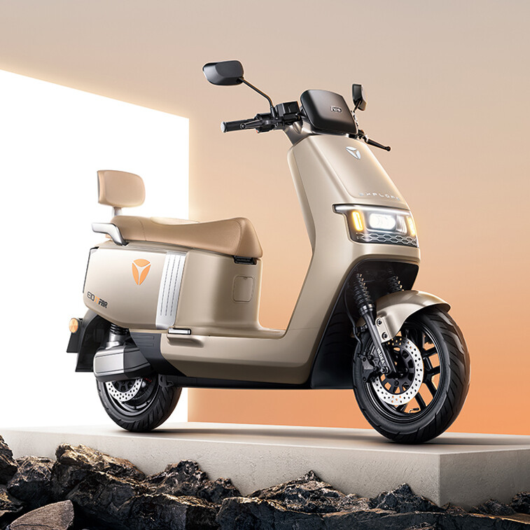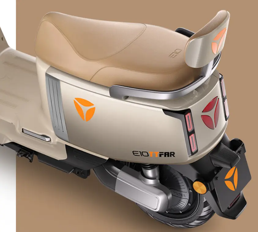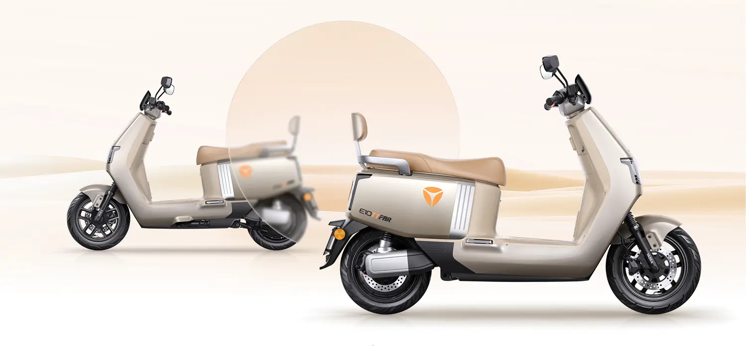Внешний вид Yadea E10 имеет пик городского эстетического дизайна: упрощенные, жесткие линии контура, новый дизайн света, серебристые соты решетки радиатора, встроенные трехмерные матричные трехлинзовые лампы с высокой яркостью и большим диапазоном. Верхняя часть фар оснащена однолинейной светодиодной полосой, а над ними располагается рельефная надпись Explore. Основной цвет скутера - "шампанское", а цвет интерьера - хаки, что дополняет оригинальную цветовую гамму.