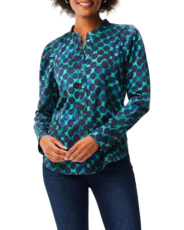 Ощутите неподвластную времени элегантность с топом NIC+ZOE Ocean Dot. Эта блузка с шикарным воротником-стойкой и длинными рукавами-буфами с манжетами на пуговицах излучает изысканность. Игривый точечный принт повсюду придает нотку причудливости, что делает эту вещь универсальной на любой случай.