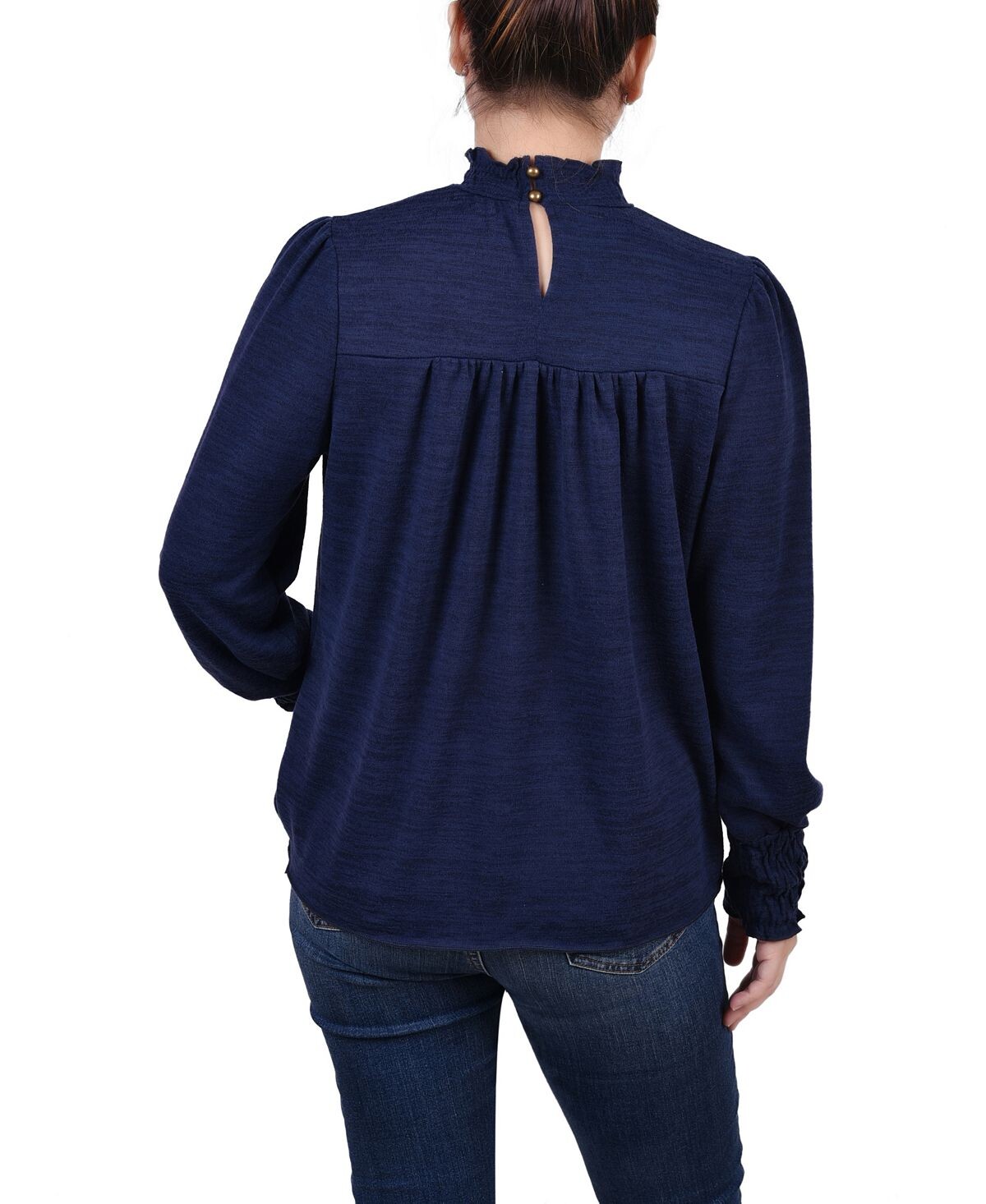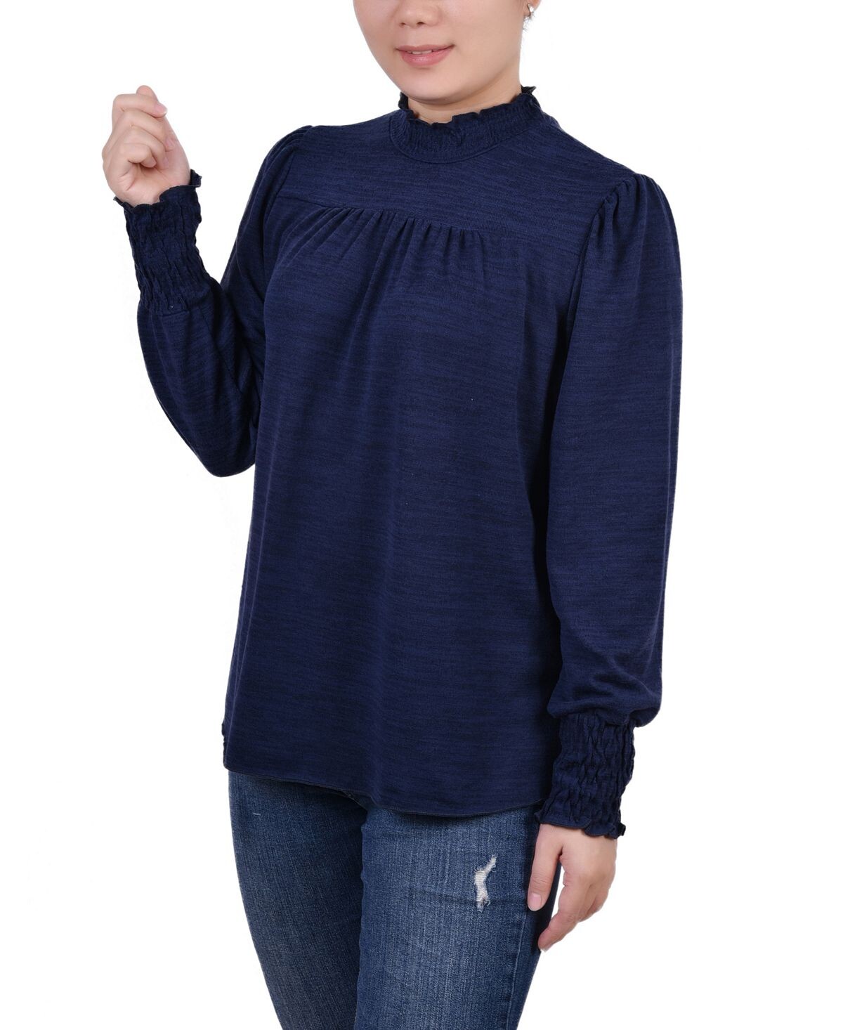 NY Collection добавила такие женственные элементы, как воротник с оборками и присборенные манжеты, к этому вязаному топу, напоминающему свитер.