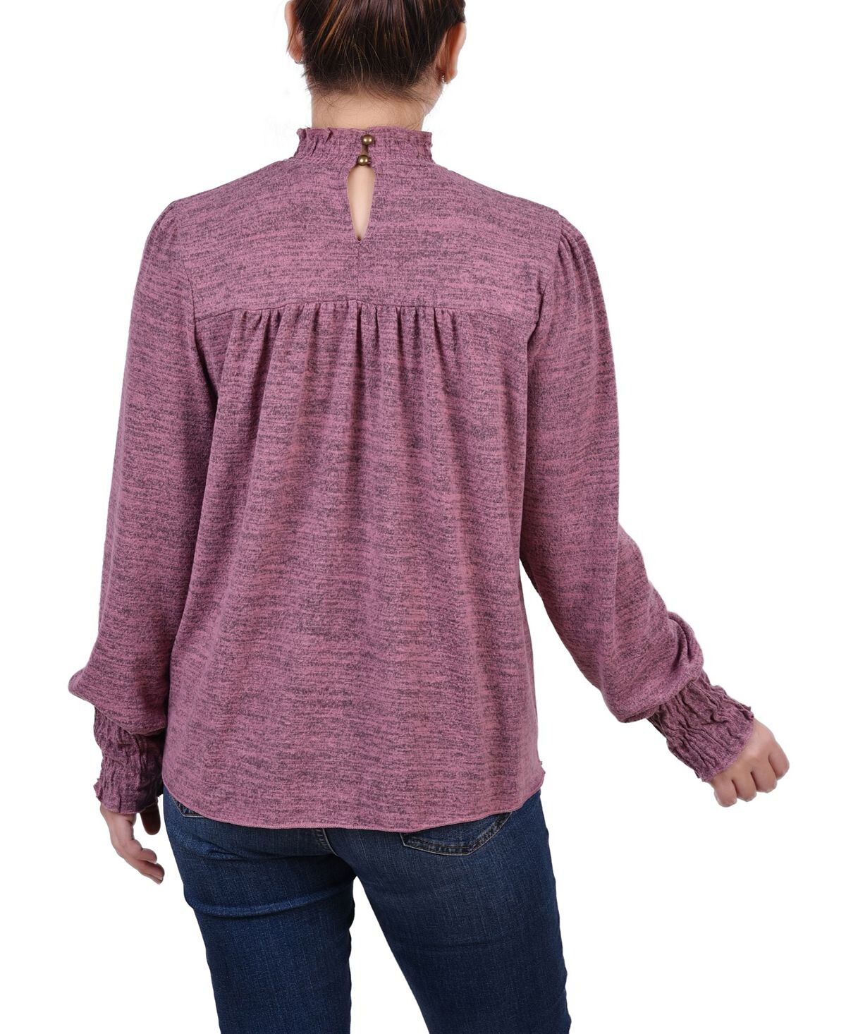 NY Collection добавила такие женственные элементы, как воротник с оборками и присборенные манжеты, к этому вязаному топу, напоминающему свитер.