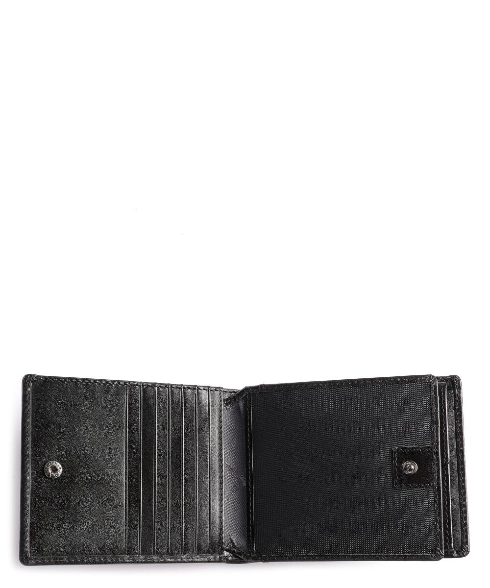 Фурнитура из металла антрацитового цвета. Подкладка из нейлона с логотипом. Перегородка/перегородка, отсек с защитой rfid-сканирования для чиповых карт. Отделение для документов, прозрачное отделение для фотографий или удостоверений личности, отделения для купюр и квитанций, отделение для монет с кнопкой. Четыре кармана. 12 слотов для кредитных карт. Материал: мелкозернистая яловая кожа. Размеры: примерно 12 х 10 х 2 см (ширина х высота х глубина). Вес: 0,1 кг.