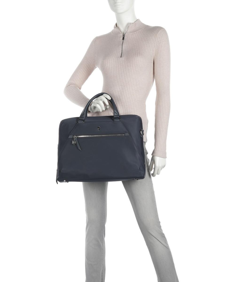 Карман на молнии спереди. Система крепления тележки. Металлические ножки. Закрывается на двусторонние молнии. Две кожаные ручки для переноски (перепад ручки 10 см). Съемный регулируемый ремень через плечо (длина примерно 70-130 см). Кожаная отделка. Фурнитура из металла антрацитового цвета. Подкладка с логотипом из полиэстера. Просторное основное отделение, подходящее для документов формата а4. Отделение на молнии. Карман. Съемная сумка. Материал: нейлон. Размеры: примерно 41 х 31 х 10 см (ширина х высота х глубина). Вес: 1,1 кг.