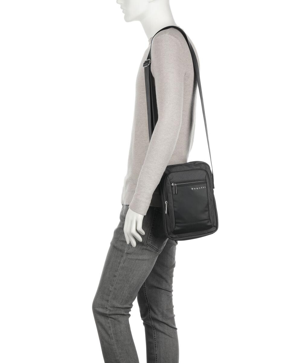 Два отделения на молнии спереди. Отделение на молнии сзади. Закрывается на молнию. Регулируемый плечевой ремень (длина примерно 80-150 см). Металлическая фурнитура из полированного серебра. Подкладка с логотипом из полиэстера. Основной предмет. Отделение с защитой rfid-сканирования для чиповых карт. Слоты для кредитных карт. Отделение на молнии. Карман. Мягкое отделение для ноутбука. Материал: полиэстер. Отделение для ноутбука: подходит для ноутбуков с диагональю до 10 дюймов. Размеры: примерно 20 х 26 х 5 см (ширина х высота х глубина). Вес: 0,3 кг.