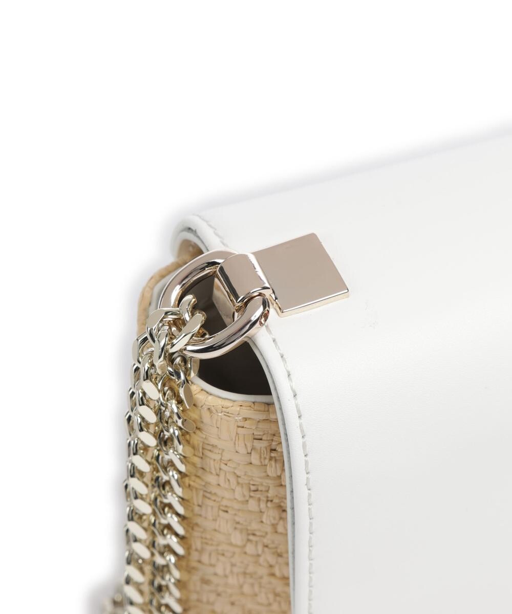 Закрывается на магнитную застежку. Регулируемый плечевой ремень (длина ок. 60-110 см). Металлическая фурнитура из полированного золота. Обычная хлопковая подкладка. Основной предмет. Отделение на молнии. Материал: полипропилен (плетеный). Размеры: примерно 24 х 15 х 6 см (ширина х высота х глубина). Вес: 0,5 кг.