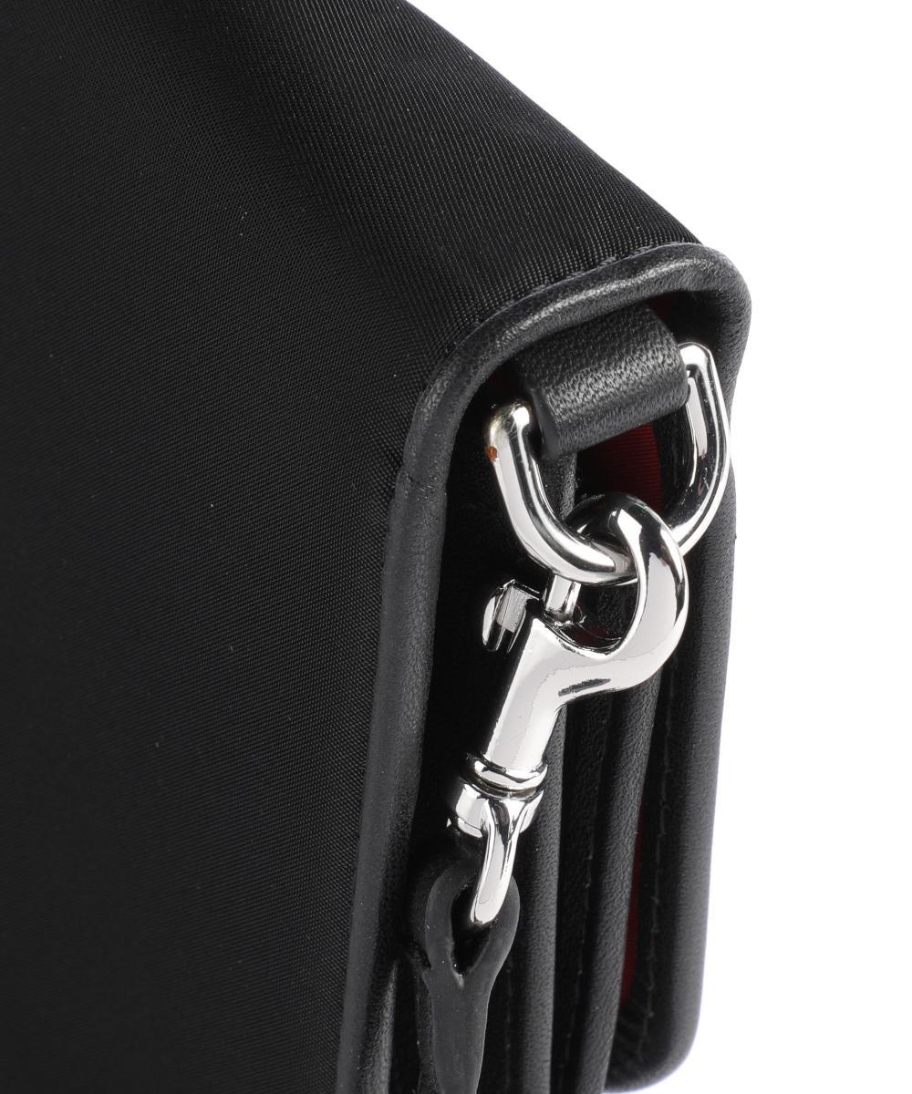 Закрывается кнопкой. Съемный регулируемый ремень через плечо (длина ок. 105-120 см). Кожаная отделка. Металлическая фурнитура из полированного серебра. Однотонная внутренняя подкладка из нейлона. Основной предмет. Отделение/слоты для карт. Отделение на молнии. Карман. Материал: нейлон. Размеры: примерно 22 х 13 х 3 см (ширина х высота х глубина). Вес: 0,2 кг.