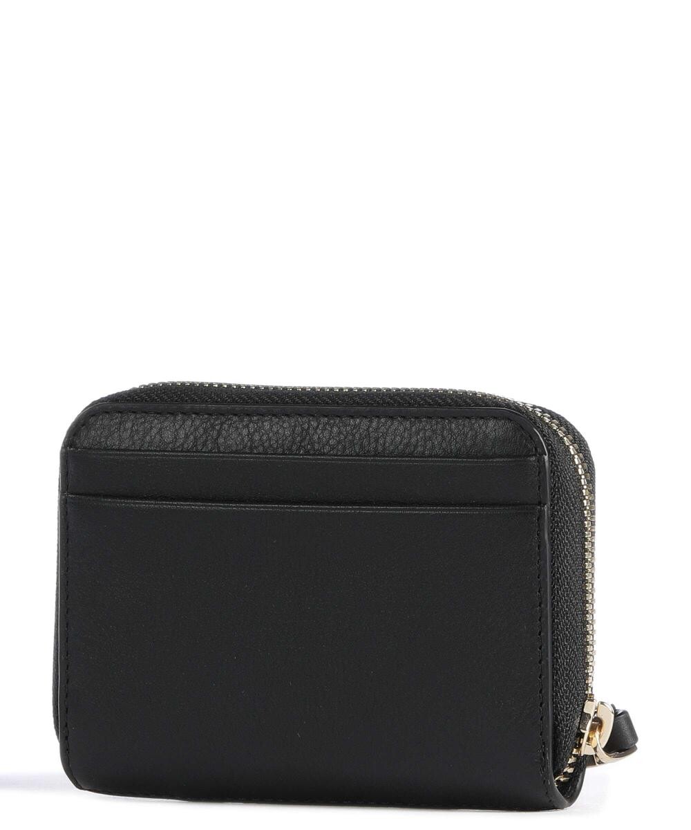 Два кармана сзади. Закрывается на молнию. Металлическая фурнитура из полированного золота. Подкладка с логотипом из полиэстера. Отделение с защитой rfid-сканирования для чиповых карт. Отделения для купюр и чеков, отделение для монет на молнии. Два слота для кредитных карт. Материал: мелкозернистая яловая кожа. Размеры: примерно 11,5 х 9 х 2 см (ширина х высота х глубина). Вес: 0,1 кг.