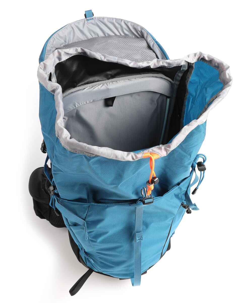Сверху отделение на молнии. Один накладной карман спереди, один карман на молнии спереди. Эластичные сетчатые отделения по бокам. Подготовка системы гидратации. Система переноски: контактная спинка, мягкая, вентилируемая. Лямки рюкзака: мягкие, вентилируемые. Застегивается на клипсу, застегивается на шнуровку. Ручка для переноски. Поясной ремень для стабилизации, с широкими плавниками, с отделением на молнии. Нагрудный ремень для стабилизации, компрессионные ремни, ремни для регулировки положения. Фурнитура из металла антрацитового цвета. Дождевик, сигнальный свисток. Основной предмет. Брелок для ключей/шнур. Отделение на молнии. Карман. Материал: полиамид. Размеры: примерно 26 х 54 х 24 см (ширина х высота х глубина). Вес: 0,9 кг. Объем: 30 л.