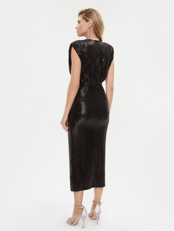 Узор: Гламур Украшения: пайетки. Застежка: на молнии. Вырез: V-образный. Рукав: Без рукавов. Детали: подплечники. Сделано в Италии. Примерка: стандартная посадка. Длина: миди. Состав: 100% Полиэстер.