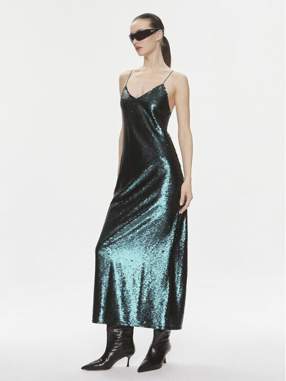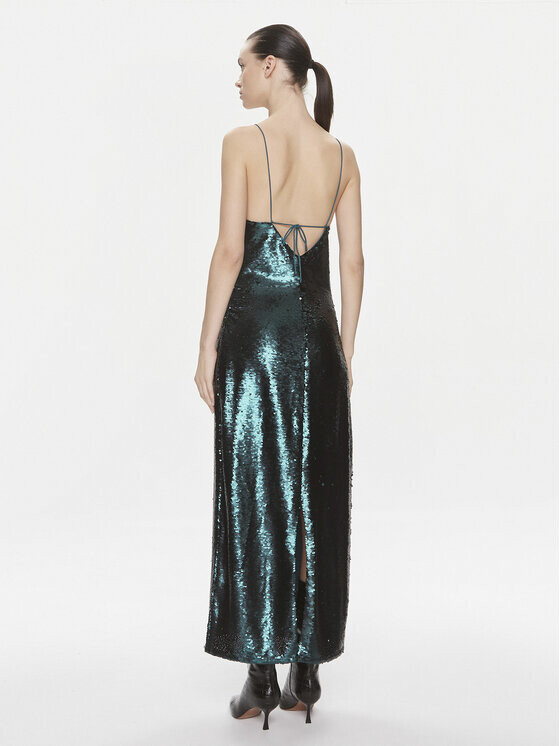 Узор: Гламур Украшения: пайетки. Застежка: на молнии. Вырез: V-образный вырез, вырез спинки. Рукава: С бретелями. Примерка: стандартная посадка. Длина: миди. Состав: 100% Полиэстер. Подкладка: 100% переработанный полиэстер.
